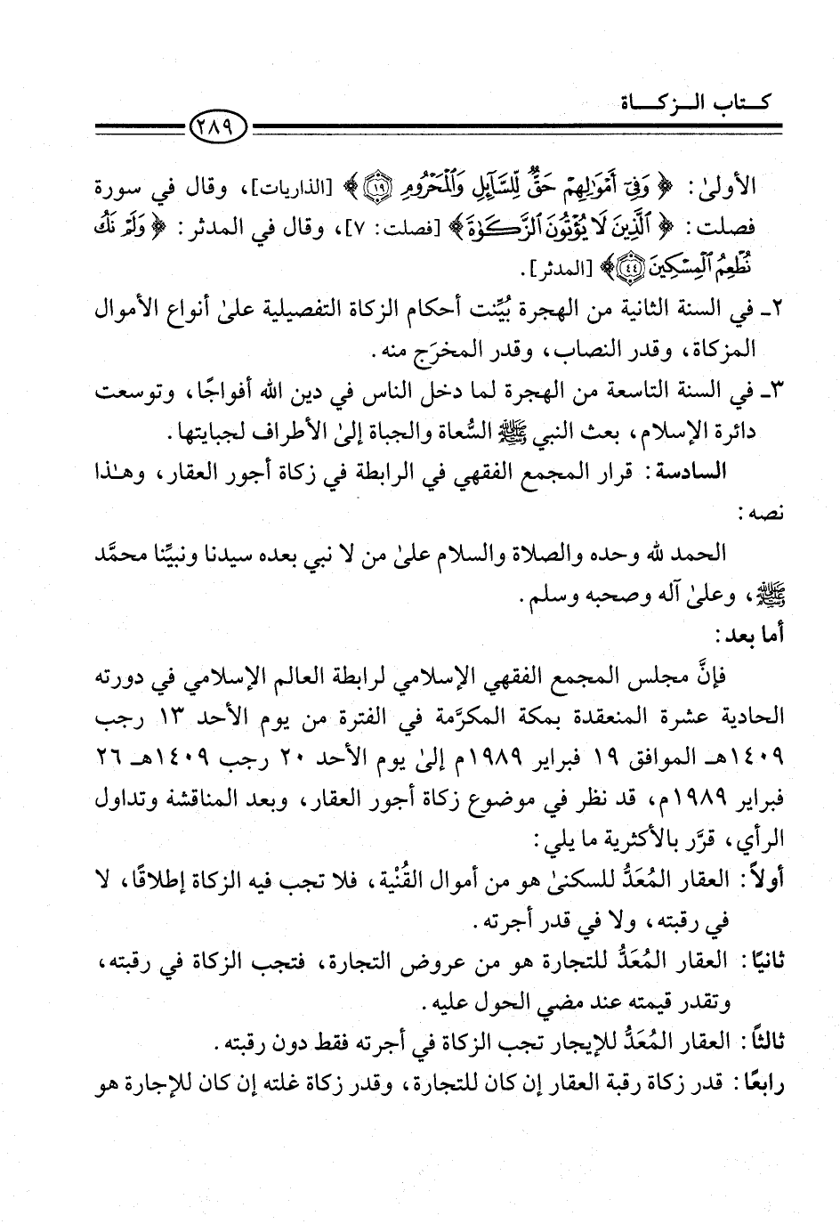 فإنَّ مجلس المجمع الفقهي الإسلامي لرابطة العالم الإسلامي في دورته الحادية عشرة المنعقدة بمكة المكرَّمة في الفترة من يوم الأحد 13 رجب 1409 هـ الموافق 19 فبراير 1989م إلى يوم الأحد 20 رجب 1409هـ 26 فبراير 1989م، قد نظر في موضوع زكاة أجور العقار، وبعد المناقشة وتداول الرأي، قرَّر بالأكثرية ما يلي:
