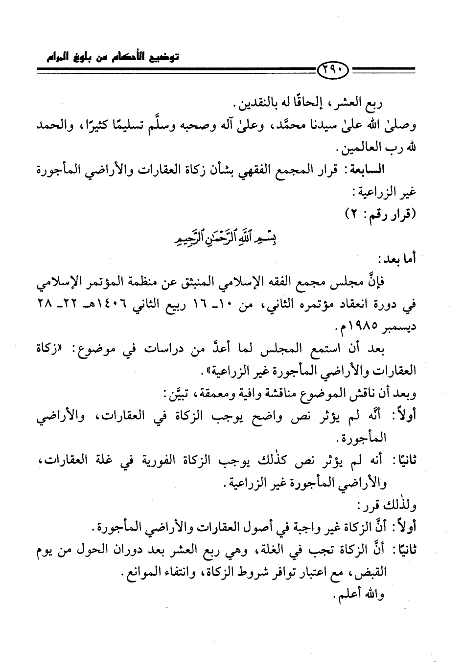 السابعة: قرار المجمع الفقهي بشأن زكاة العقارات والأراضي المأجورة غير الزراعية: