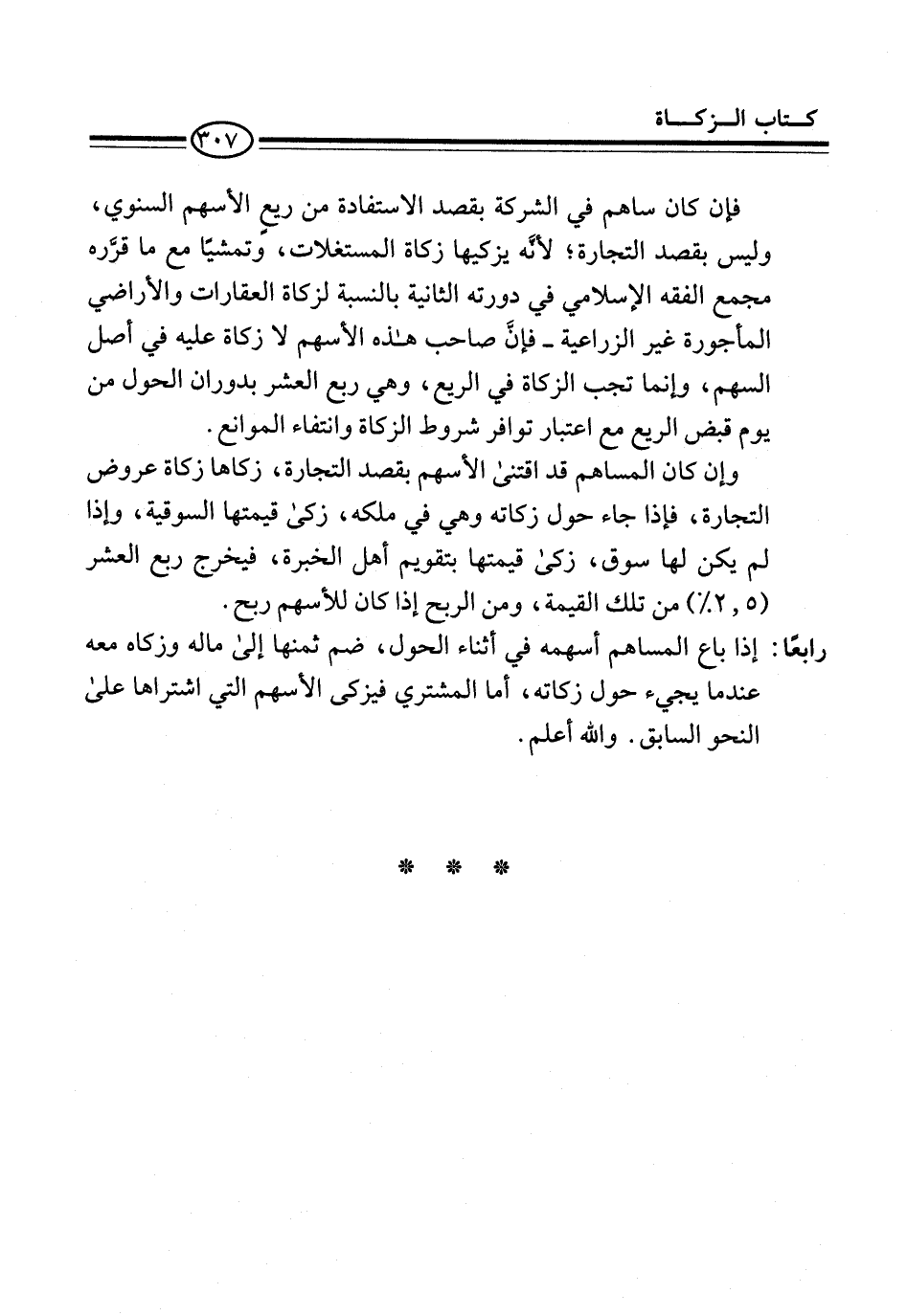 فإن كان ساهم في الشركة بقصد الاستفادة من ريع الأسهم السنوي، وليس بقصد التجارة؛ لأنَّه يزكيها زكاة المستغلات، وتمشيًا مع ما قرَّره مجمع الفقه الإسلامي في دورته الثانية بالنسبة لزكاة العقارات والأراضي المأجورة غير الزراعية -فإنَّ صاحب هذه الأسهم لا زكاة عليه في أصل السهم، وإنما تجب الزكاة في الريع، وهي ربع العشر بدوران الحول من يوم قبض الريع مع اعتبار توافر شروط الزكاة وانتفاء الموانع.
