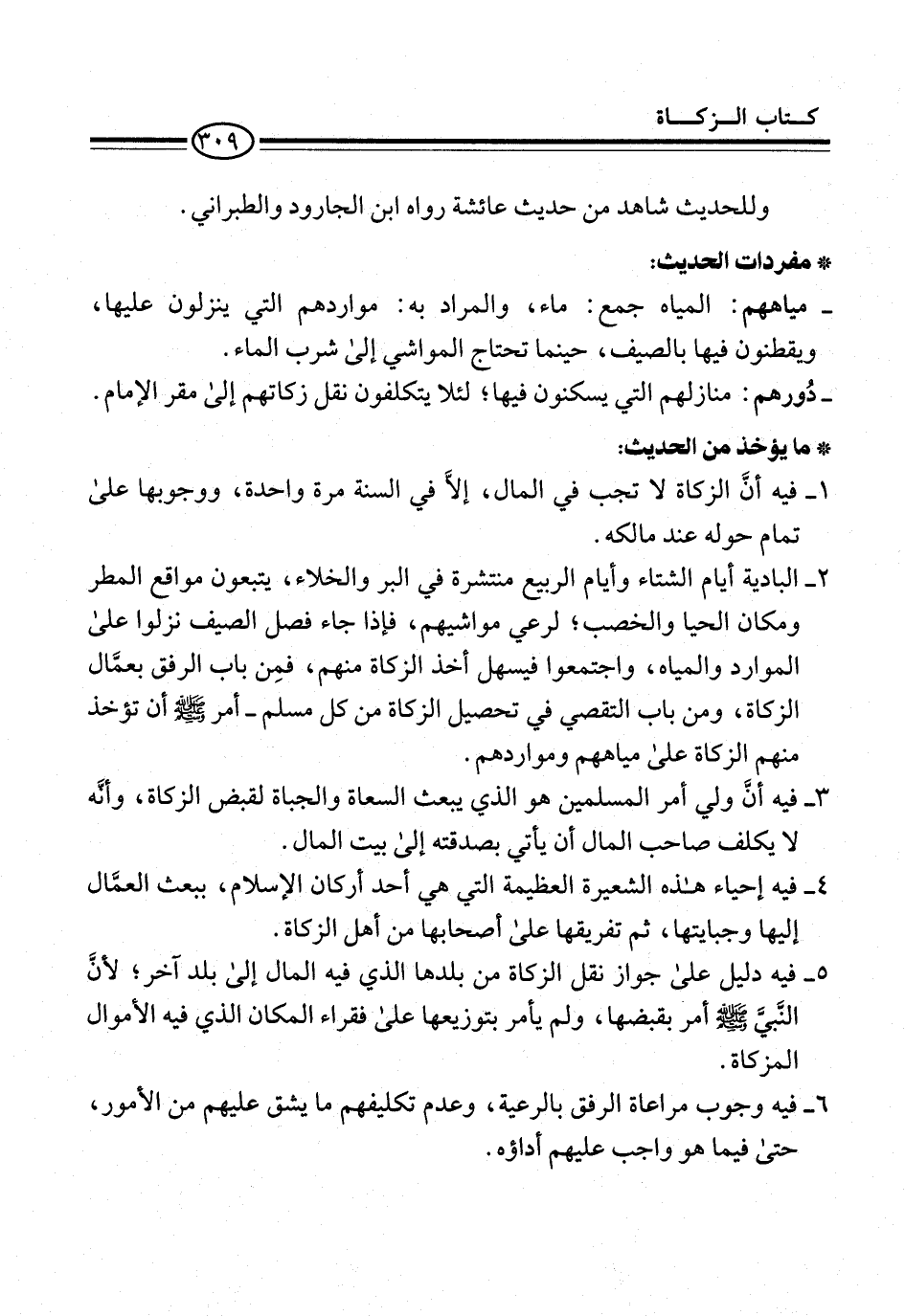 2 - البادية أيام الشتاء وأيام الربيع منتشرة في البر والخلاء، يتبعون مواقع المطر ومكان الحيا والخصب؛ لرعي مواشيهم، فإذا جاء فصل الصيف نزلوا على الموارد والمياه، واجتمعوا فيسهل أخذ الزكاة منهم، فمِن باب الرفق بعمَّال الزكاة، ومن باب التقصي في تحصيل الزكاة من كل مسلم -أمر -صلى الله عليه وسلم- أن تؤخذ منهم الزكاة على مياههم ومواردهم.