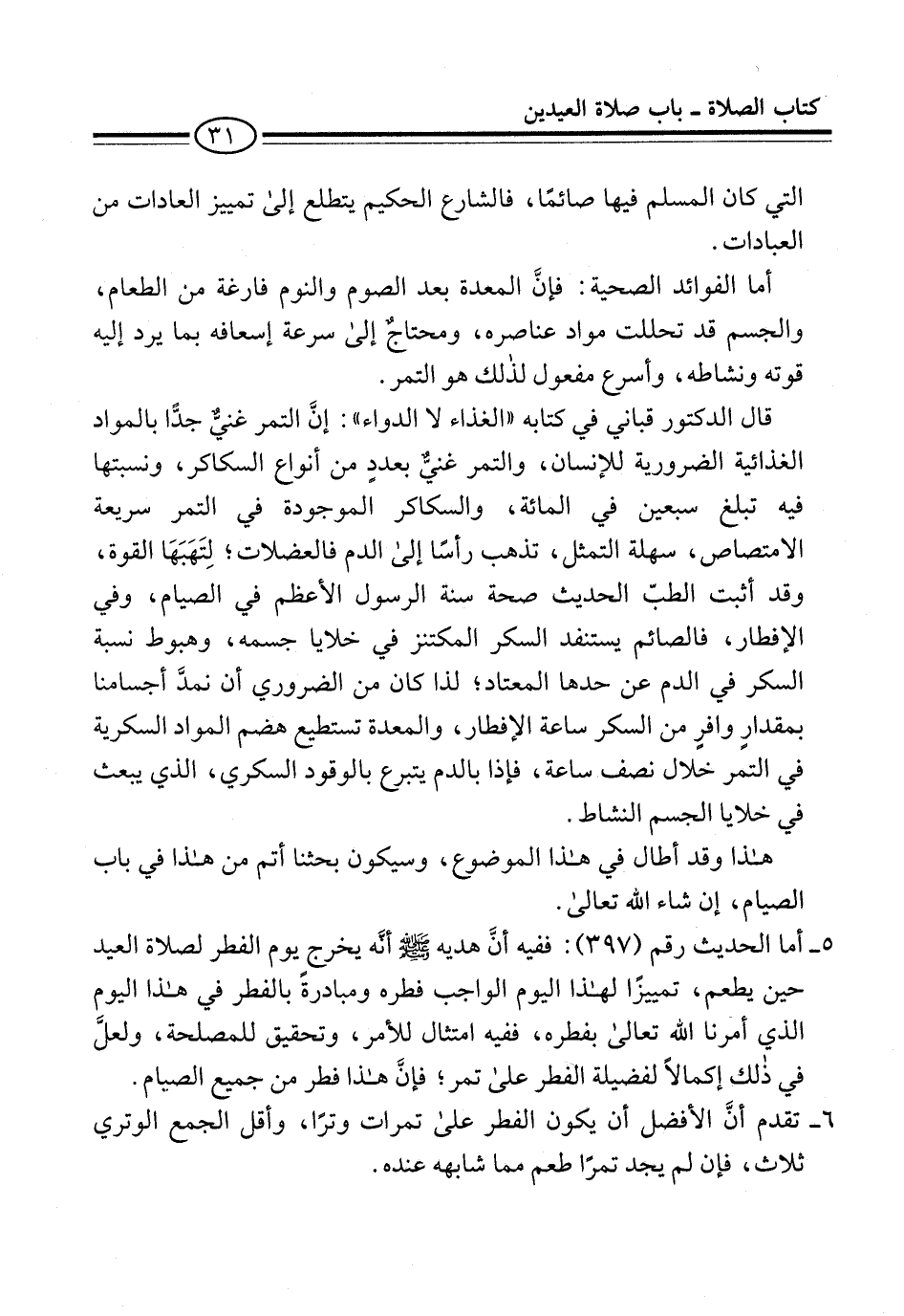 5 - أما الحديث رقم (397): ففيه أنَّ هديه -صلى الله عليه وسلم- أنَّه يخرج يوم الفطر لصلاة العيد حين يطعم، تمييزًا لهذا اليوم الواجب فطره ومبادرةً بالفطر في هذا اليوم الذي أمرنا الله تعالى بفطره، ففيه امتثال للأمر، وتحقيق للمصلحة، ولعلَّ في ذلك إكمالاً لفضيلة الفطر على تمر؛ فإن هذا فطر من جميع الصيام.