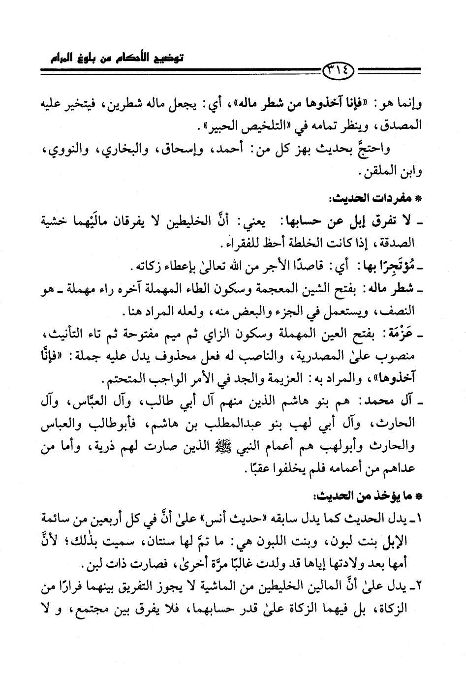 2 - يدل على أنَّ المالين الخليطين من الماشية لا يجوز التفريق بينهما فرارًا من الزكاة، بل فيهما الزكاة على قدر حسابهما، فلا يفرق بين مجتمع، ولا
