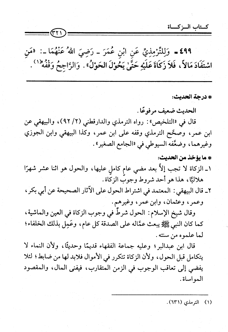 499 - وَلِلتِّرْمِذِيِّ عَنِ ابْنِ عُمَرَ -رَضِيَ اللهُ عَنْهُمَا-: "مَنِ اسْتَفَادَ مَالاً، فَلاَ زَكاةَ عَلَيْهِ حَتَّى يَحُوْلَ الحَوْلُ". وَالرَّاجِحُ وَقْفُهُ (¬1).