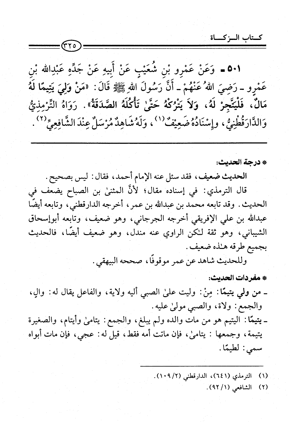501 - وَعَنْ عَمْرِو بْنِ شُعَيْبٍ عَنْ أَبِيهِ عَنْ جَدِّهِ عَبْدِ الله بْنِ عَمْرو -رَضِيَ اللهُ عَنْهُمْ- أَنَّ رَسُولَ اللهِ -صلى الله عليه وسلم- قَالَ: "مَنْ وَلِيَ يَتِيمًا لَهُ مَالٌ، فَلْيَتَّجِرْ لَهُ، وَلاَ يَتْرُكْهُ حَتَّى تَأْكُلَهُ الصَّدَقَهُ". رَوَاهُ التِّرْمِذِيُّ وَالدَّارَقُطْنِيُّ، وإِسْنَادُهُ ضَعِيْفٌ (¬1)، وَلَهُ شَاهِدٌ مُرْسَلٌ عِنْدَ الشَّافِعِيِّ (¬2).