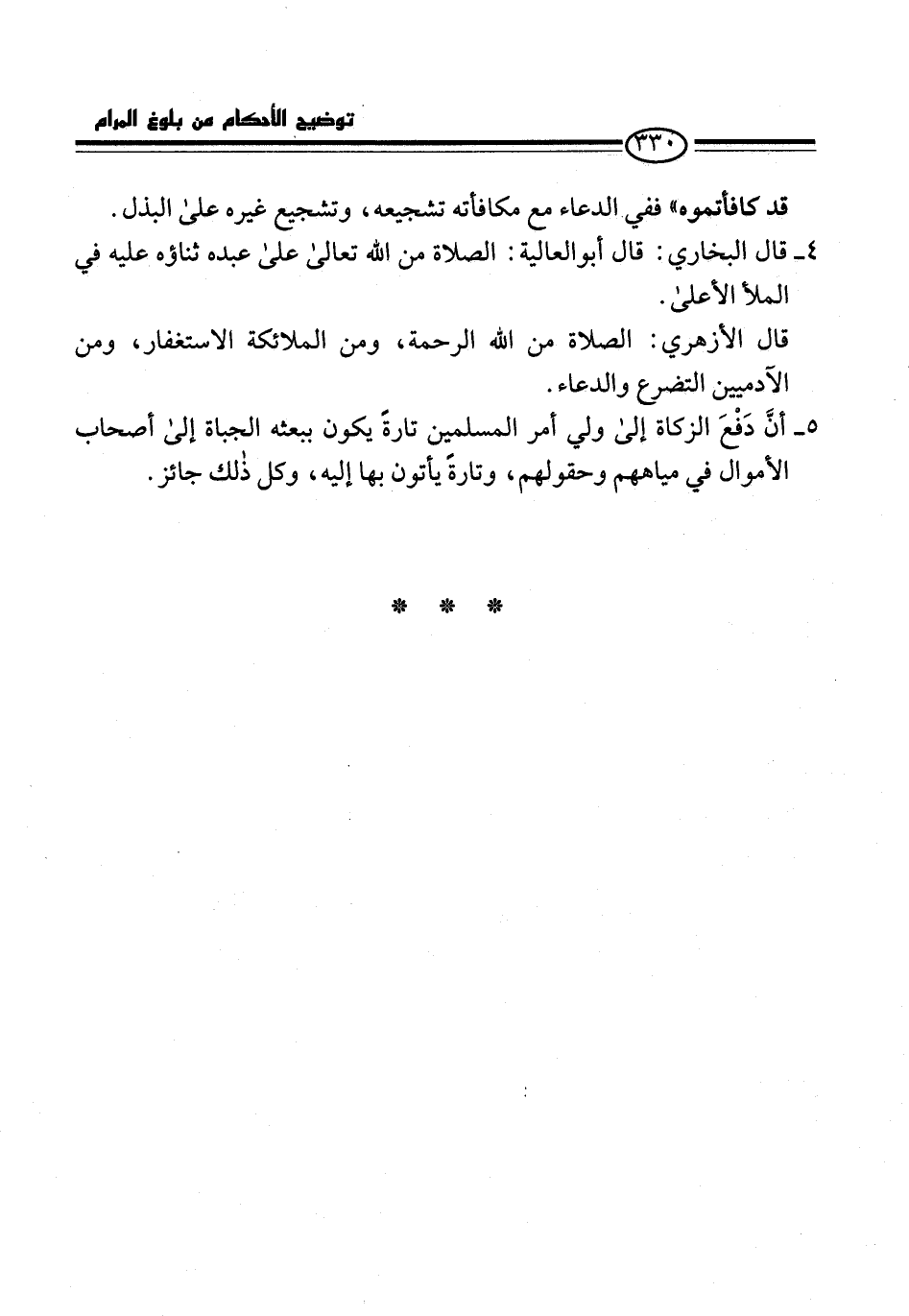 4 - قال البخاري: قال أبو العالية: الصلاة من الله تعالى على عبده ثناؤه عليه في الملأ الأعلى.