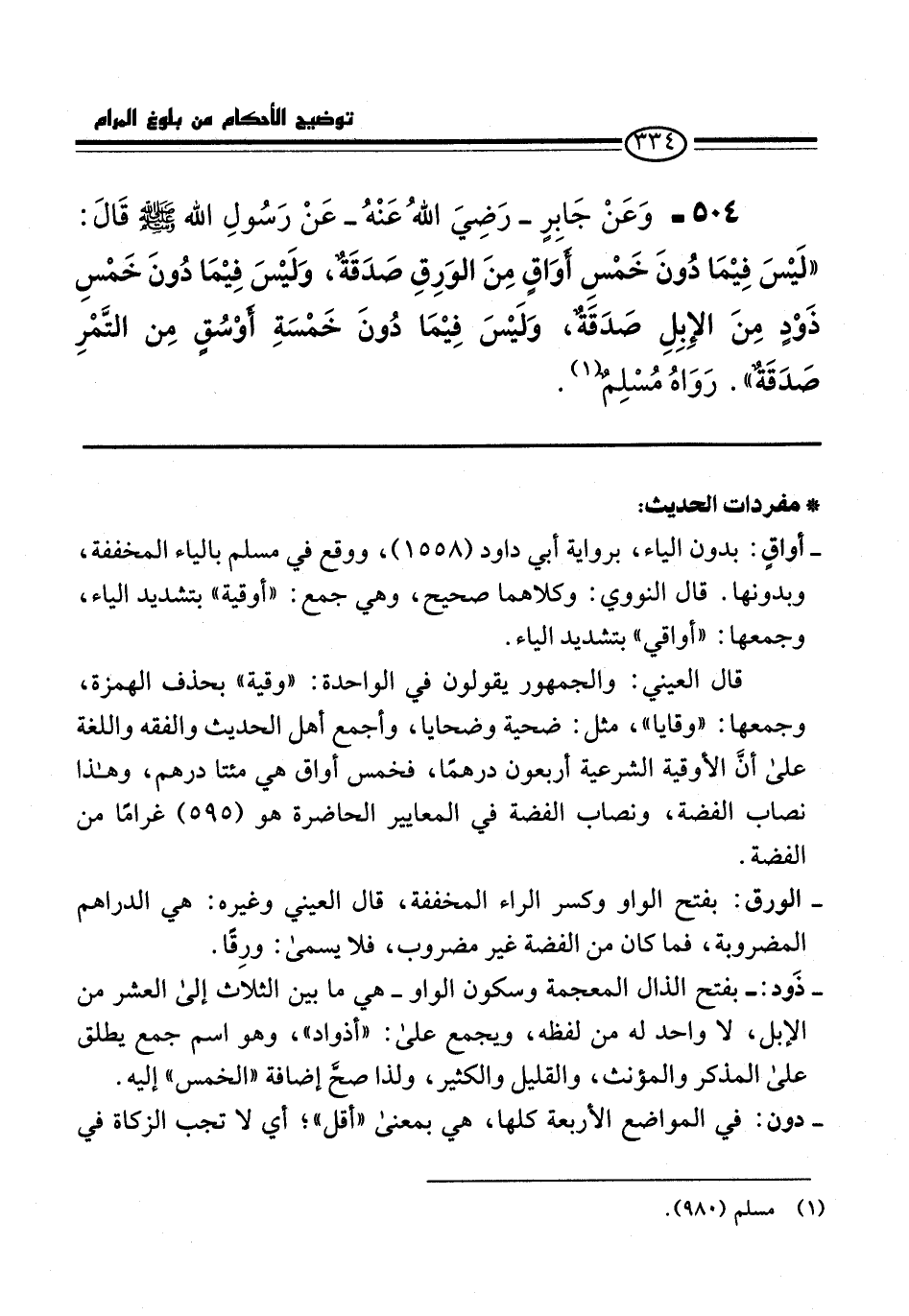 504 - وَعَنْ جَابرٍ -رَضِيَ اللهُ عَنْهُ- عَنْ رَسُولِ الله -صلى الله عليه وسلم-قالَ: "لَيْسَ فِيْمَا دُونَ خَمْسِ أوَاقٍ مِنَ الوَرِقِ صَدَقَةٌ، وَلَيْسَ فِيْمَا دُونَ خَمْسِ ذَوْدٍ مِنَ الإِبِلِ صَدَقَةٌ، وَلَيْسَ فِيْمَا دُونَ خَمْسَةِ أوْسُقٍ مِن التَّمْرِ صَدَقَةٌ". رَوَاهُ مُسْلِمٌ (¬1).