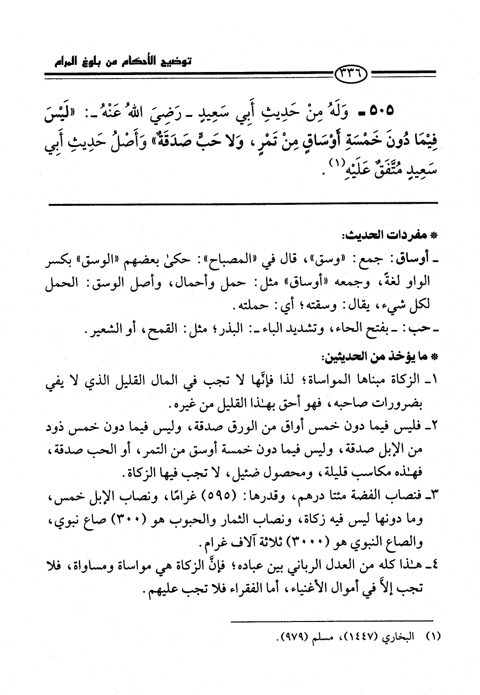 505 - وَلَهُ مِنْ حَدِيثِ أَبِي سَعِيدٍ -رَضِيَ اللهُ عَنْهُ-: "لَيْسَ فِيْمَا دُونَ خَمْسَةِ أوْسَاقٍ مِنْ تَمْرٍ، وَلا حَبٍّ صَدَقَةٌ" وَأَصْلُ حَدِيثِ أَبِي سَعِيدٍ مُتَّفَقٌ عَلَيْهِ (¬1).
