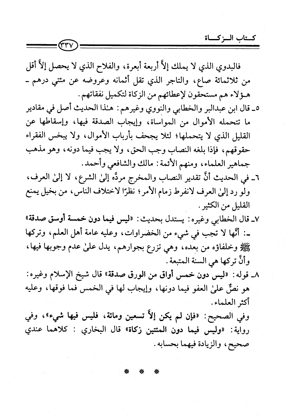 5 - قال ابن عبد البر والخطابي والنووي وغيرهم: هذا الحديث أصل في مقادير ما تتحمله الأموال من الموأساة، وإيجاب الصدقة فيها، وإسقاطها عن القليل الذي لا يتحملها؛ لئلا يجحف بأرباب الأموال، ولا يبخس الفقراء حقوقهم، فإذا بلغه النصاب وجب الحق، ولا يجب فيما دونه، وهو مذهب جماهير العلماء، ومنهم الأئمة: مالك والشافعي وأحمد.