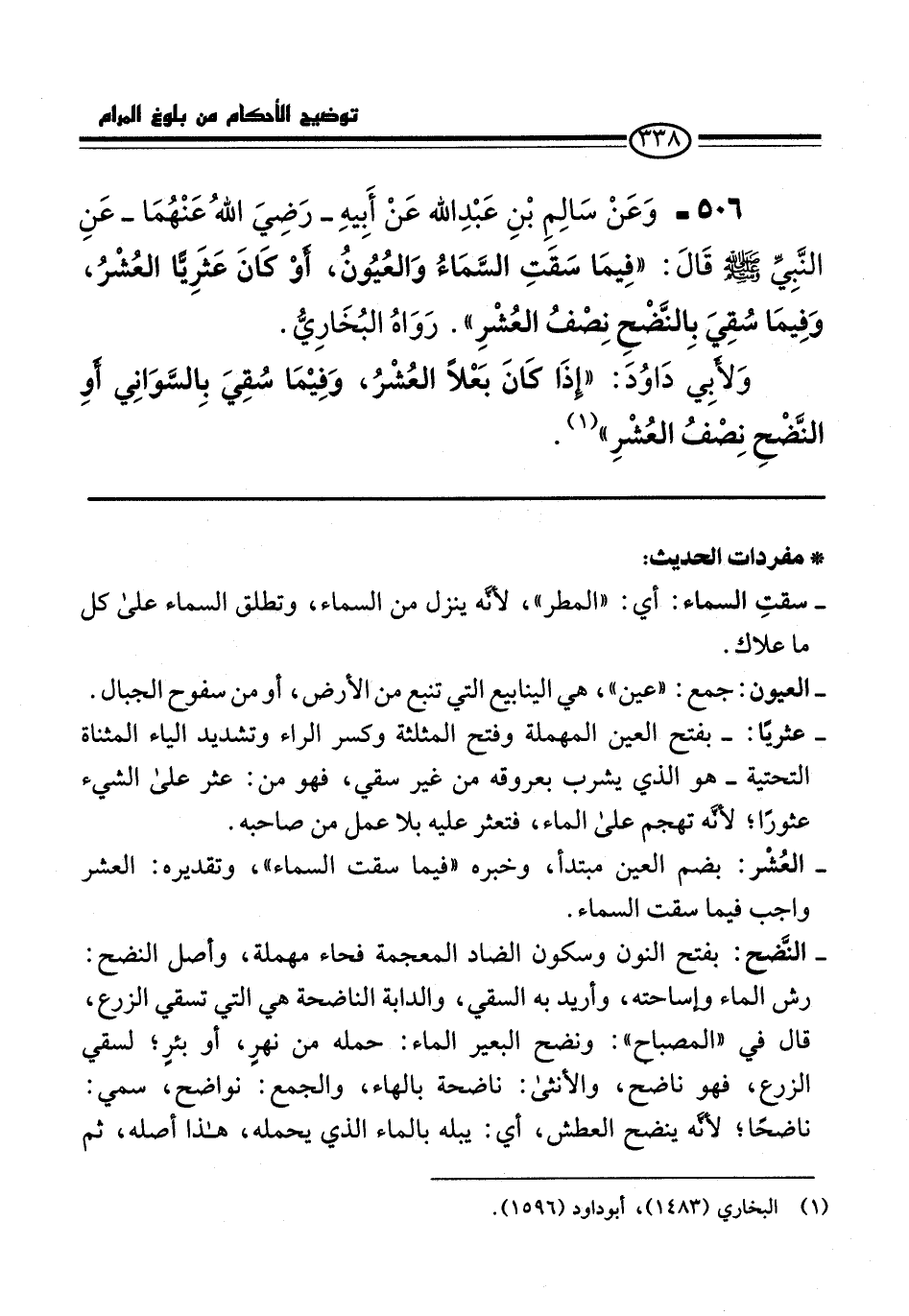 506 - وَعَنْ سَالِمِ بْنِ عَبْدِ الله عَنْ أبِيهِ -رَضِيَ اللهُ عَنْهُمَا- عَنِ النَّبِيِّ -صلى الله عليه وسلم- قَالَ: "فِيمَا سَقَتِ السَّمَاءُ وَالعُيُونُ، أوْ كَانَ عَثَرِيًّا العُشْرُ، وَفِيمَا سُقِيَ بِالنَّضْحِ نِصْفُ العُشْرِ". رَوَاهُ البُخَارِيُّ.