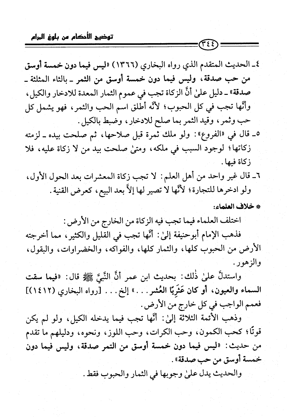 4 - الحديث المتقدم الذي رواه البخاري (1366) "ليس فيما دون خمسة أوسق من حب صدقة، وليس فيما دون خمسة أوسق من الثمر -بالثاء المثلثة- صدقة" -دليل على أنَّ الزكاة تجب في عموم الثمار المعدة للادخار والكيل، وأنَّها تجب في كل الحبوب؛ لأنَّه أطلق اسم الحب والثمر، فهو يشمل كل حب وثمر، وقيد الثمر بما صلح للادخار، وضبط بالكيل.