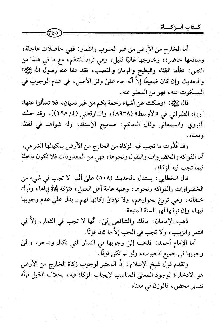 أما الخارج من الأرض من غير الحبوب والثمار: فهي حاصلات عاجلة، ومنافعها حاضرة، وخارجها غالبًا قليل، وهي تراد للتنعّم، مع ما في هذا من النص: "فأما القثاء والبطيخ والرمان والقصب، فقد عفا عنه رسول الله -صلى الله عليه وسلم- والحديث وإن كان ضعيفًا إلاَّ أنَّه جاء على وفق الأصل، في عدم الوجوب في المسكوت عنه، فهو من المعفو عنه.
