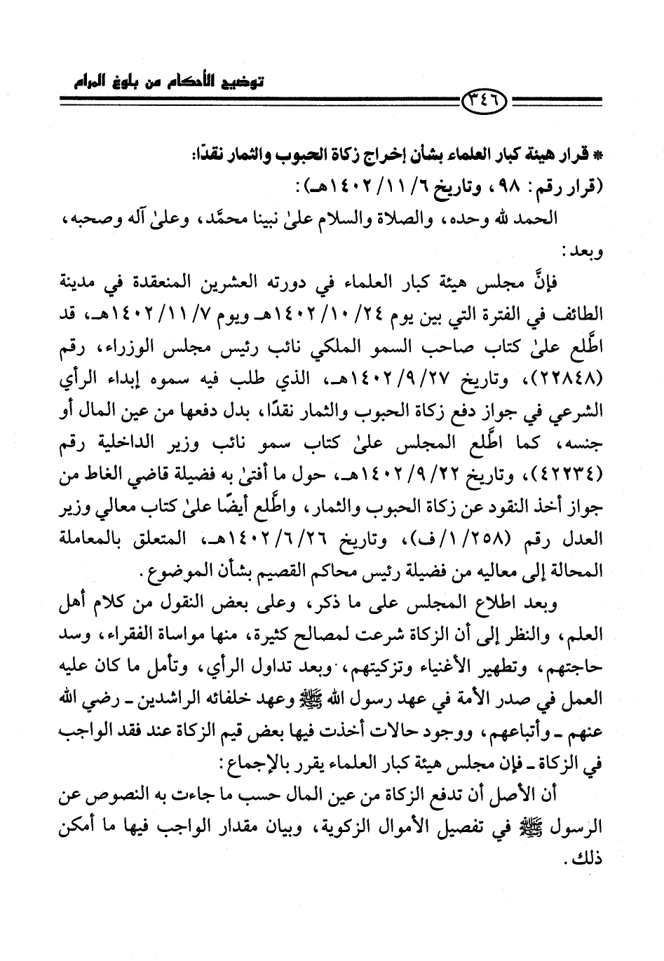فإنَّ مجلس هيئة كبار العلماء في دورته العشرين المنعقدة في مدينة الطائف في الفترة التي بين يوم 24/ 10/ 1452 هـ ويوم 7/ 11/ 1402 هـ , قد اطَّلع على كتاب صاحب السمو الملكي نائب رئيس مجلس الوزراء، رقم (22848)، وتاريخ 27/ 9/ 1402 هـ، الذي طلب فيه سموه إبداء الرأي الشرعي في جواز دفع زكاة الحبوب والثمار نقدًا، بدل دفعها من عين المال أو جنسه، كما اطَّلع المجلس على كتاب سمو نائب وزير الداخلية رقم (42234)، وتاريخ 22/ 9/ 1402 هـ، حول ما أفتى به فضيلة قاضي الغاط من جواز أخذ النقود عن زكاة الحبوب والثمار، واطَّلع أيضًا على كتاب معالي وزير العدل رقم (258/ 1/ ف)، وتاريخ 26/ 6/ 1402 هـ، المتعلق بالمعاملة المحالة إلى معاليه من فضيلة رئيس محاكم القصيم بشأن الموضوع.