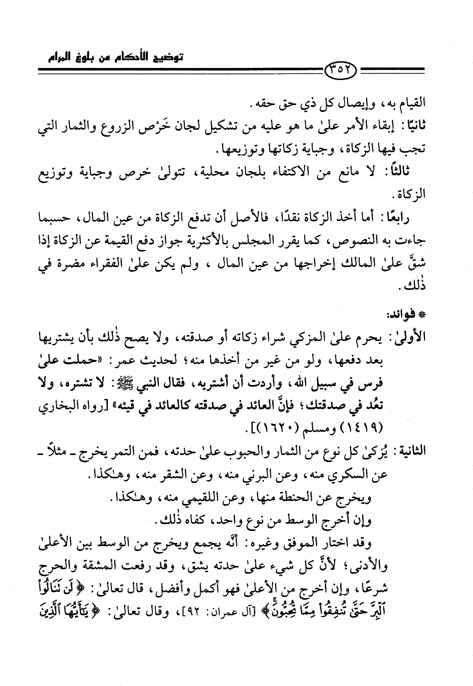 الأولى: يحرم على المزكي شراء زكاته أو صدقته، ولا يصح ذلك بأن يشتريها بعد دفعها، ولو من غير من أخذها منه؛ لحديث عمر: "حملت على فرس في سبيل الله، وأردت أن أشتريه، فقال النبي -صلى الله عليه وسلم-: لا تشتره، ولا تعُد في صدقتك؛ فإنَّ العائد في صدقته كالعائد في قيئه" [رواه البخاري (1419) ومسلم (1620)].