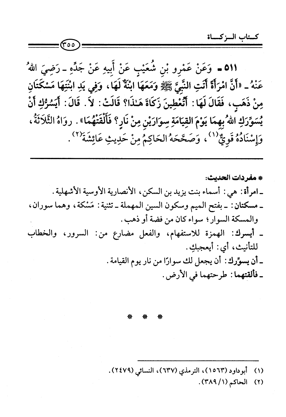 511 - وَعَنْ عَمْرِو بْنِ شُعَيْبٍ عَنْ أَبِيهِ عَنْ جَدِّهِ -رَضِيَ اللهُ عَنْهُ- "أنَّ امْرَأَةً أَتَتِ النَّبِيَّ -صلى الله عليه وسلم- وَمَعَهَا ابْنَةٌ لَهَا، وَفِي يَدِ ابْنَتِهَا مَسْكَتَانِ مِنْ ذَهبٍ، فَقَالَ لَهَا: أَتُعْطِينَ زَكَاةَ هَذَا؟ قَالَتْ: لاَ. قَالَ: أَيَسُرُّكِ أنْ يُسَوِّرَكِ اللهُ بِهِمَا يَوْمَ القِيَامَةِ سِوَارَيْنِ مِنْ نَارٍ؟ فَأَلْقَتْهُمَا". روَاهُ الثَّلاَثَةُ، وَإِسْنَادُهُ قَوِيٌّ (¬1)، وَصَحَّحَهُ الحَاكِمُ مِنْ حَدِيثِ عَائِشَةَ (¬2).