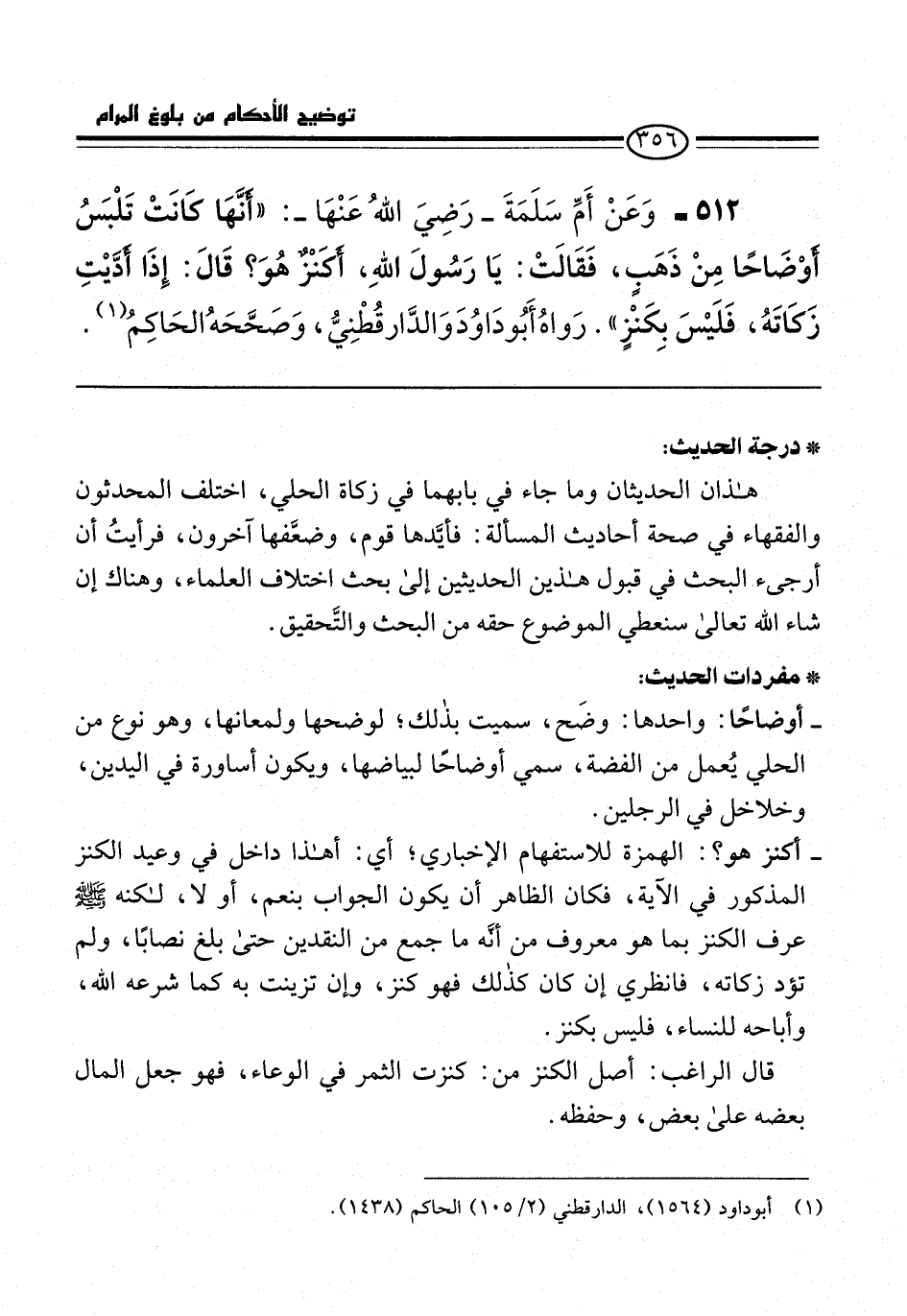 512 - وَعَنْ أَمِّ سَلَمَةَ -رَضِيَ اللهُ عَنْهَا-: "أنَّهَا كَانَتْ تَلْبَسُ أوْضَاحًا مِنْ ذَهَبٍ، فَقَالَتْ: يَا رَسُولَ اللهِ، أكَنْزٌ هُوَ؟ قَالَ: إِذَا أدَّيْتِ زَكَاتَهُ، فَلَيْسَ بِكَنْزٍ". رَواهُ أَبُو دَاوُدَ وَالدَّارقُطْنِيُّ، وَصَحَّحَهُ الحَاكِمُ (¬1).