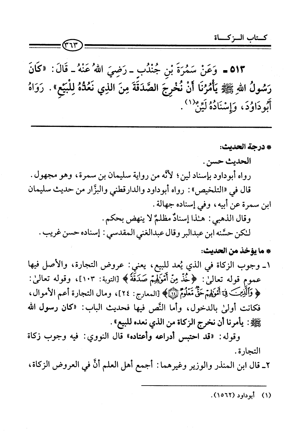 513 - وَعَنْ سَمُرَةَ بْنِ جُنْدُبٍ -رَضِيَ اللهُ عَنْهُ- قَالَ: "كَانَ رَسُولُ الله -صلى الله عليه وسلم- يَأْمُرُنَا أنْ نُخْرِجَ الصَّدَقَةَ مِنَ الذِي نَعُدُّهُ لِلْبَيْعِ". رَوَاهُ أَبُو دَاوُدَ، وَإِسْنَادُهُ لَيِّنٌ (¬1).