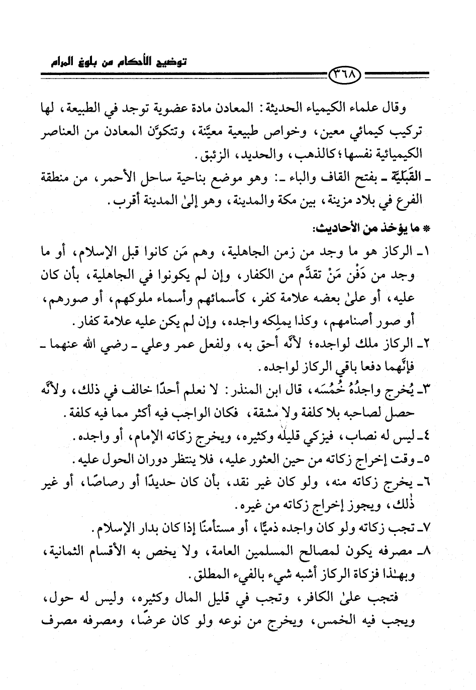 1 - الركاز هو ما وجد من زمن الجاهلية، وهم مَن كانوا قبل الإسلام، أو ما وجد من دَفْن مَنْ تقدَّم من الكفار، وإن لم يكونوا في الجاهلية، بأن كان عليه، أو على بعضه علامة كفر، كأسمائهم وأسماء ملوكهم، أو صورهم، أو صور أصنامهم، وكذا يملِكه واجده، وإن لم يكن عليه علامة كفار.