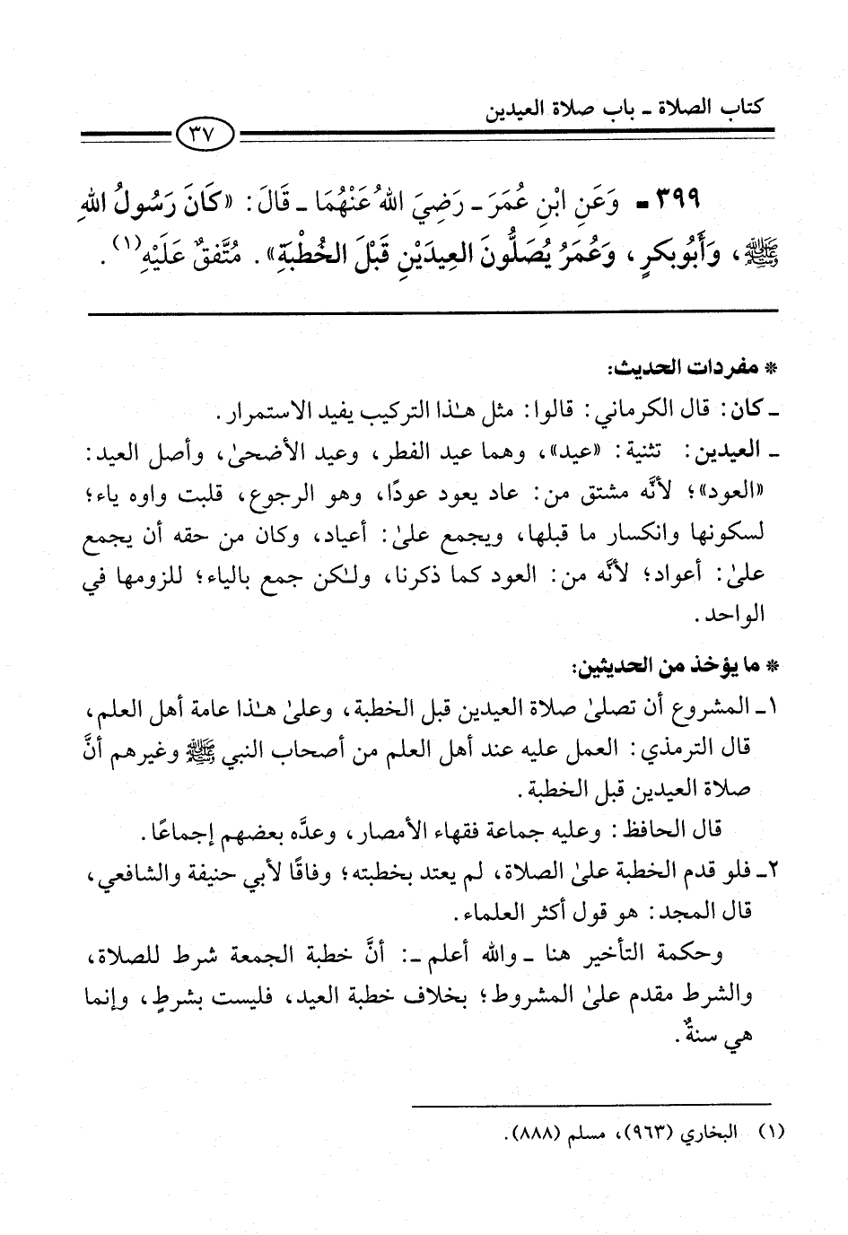 399 - وَعَنِ ابْنِ عُمَرَ -رَضِيَ اللهُ عَنْهُمَا- قَالَ: "كَانَ رَسُولُ اللهِ -صلى الله عليه وسلم-، وَأبُو بكرٍ، وَعُمَرُ يُصَلُّونَ العِيدَيْنِ قَبْلَ الخُطْبْةِ". مُتَّفقٌ عَلَيْهِ (¬1).