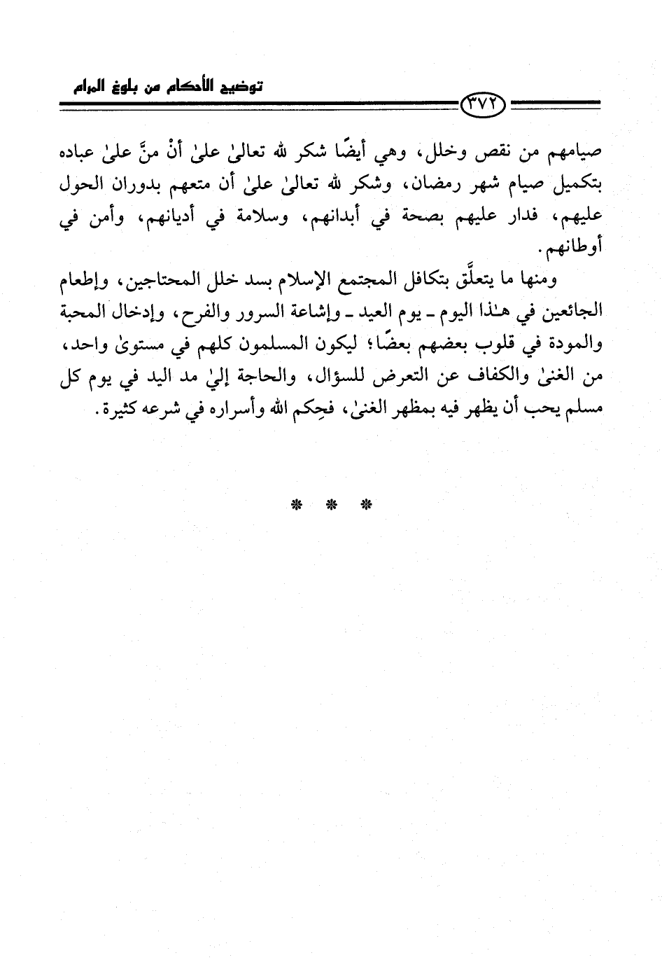 ومنها ما يتعلَّق بتكافل المجتمع الإسلام بسد خلل المحتاجين، وإطعام الجائعين في هذا اليوم -يوم العيد-وإشاعة السرور والفرح، وإدخال المحبة والمودة في قلوب بعضهم بعضًا؛ ليكون المسلمون كلهم في مستوى واحد، من الغنى والكفاف عن التعرض للسؤال، والحاجة إلي مد اليد في يوم كل مسلم يحب أن يظهر فيه بمظهر الغنى، فحِكم الله وأسراره في شرعه كثيرة.