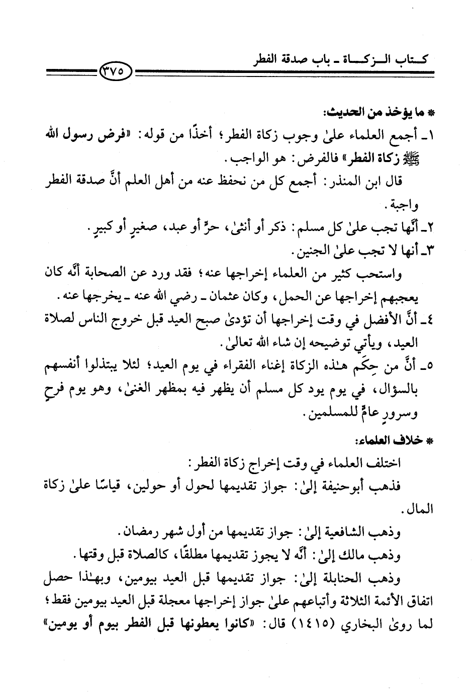 4 - أنَّ الأفضل في وقت إخراجها أن تؤدى صبح العيد قبل خروج الناس لصلاة العيد، ويأتي توضيحه إن شاء الله تعالى.