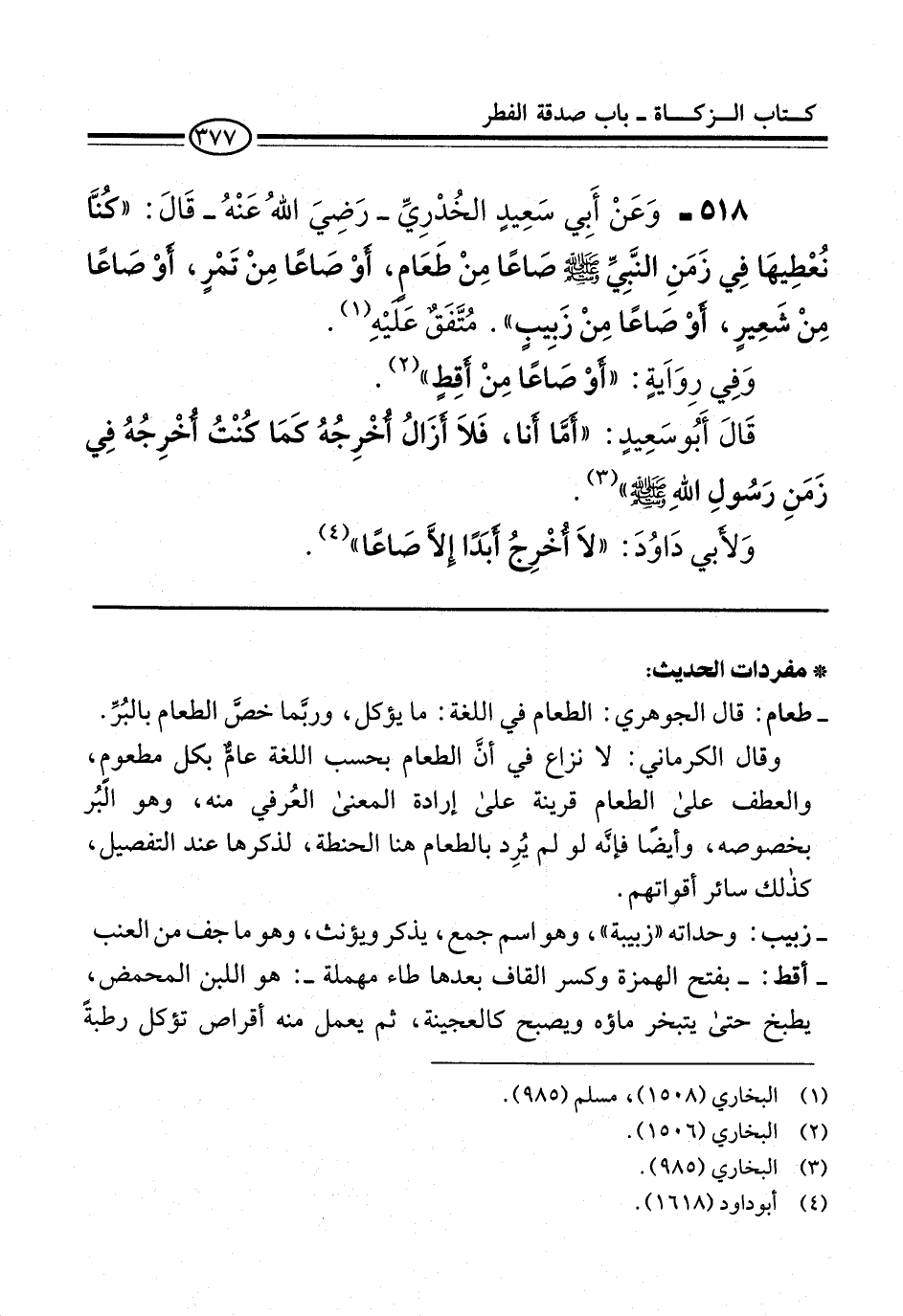 518 - وَعَنْ أَبِي سَعِيدٍ الخُدْرِيِّ -رَضِيَ اللهُ عَنْهُ- قَالَ: "كُنَّا نُعْطِيهَا فِي زَمَنِ النَّبيِّ -صلى الله عليه وسلم- صَّاعًا مِنْ طَعَام، أوْ صَاعًا مِنْ تَمْرٍ، أوْ صَاعًا مِنْ شَعِيرٍ، أوْ صَاعًا مِنْ زَبِيبٍ". مُتَّفَقٌ عَليْهِ (¬1).