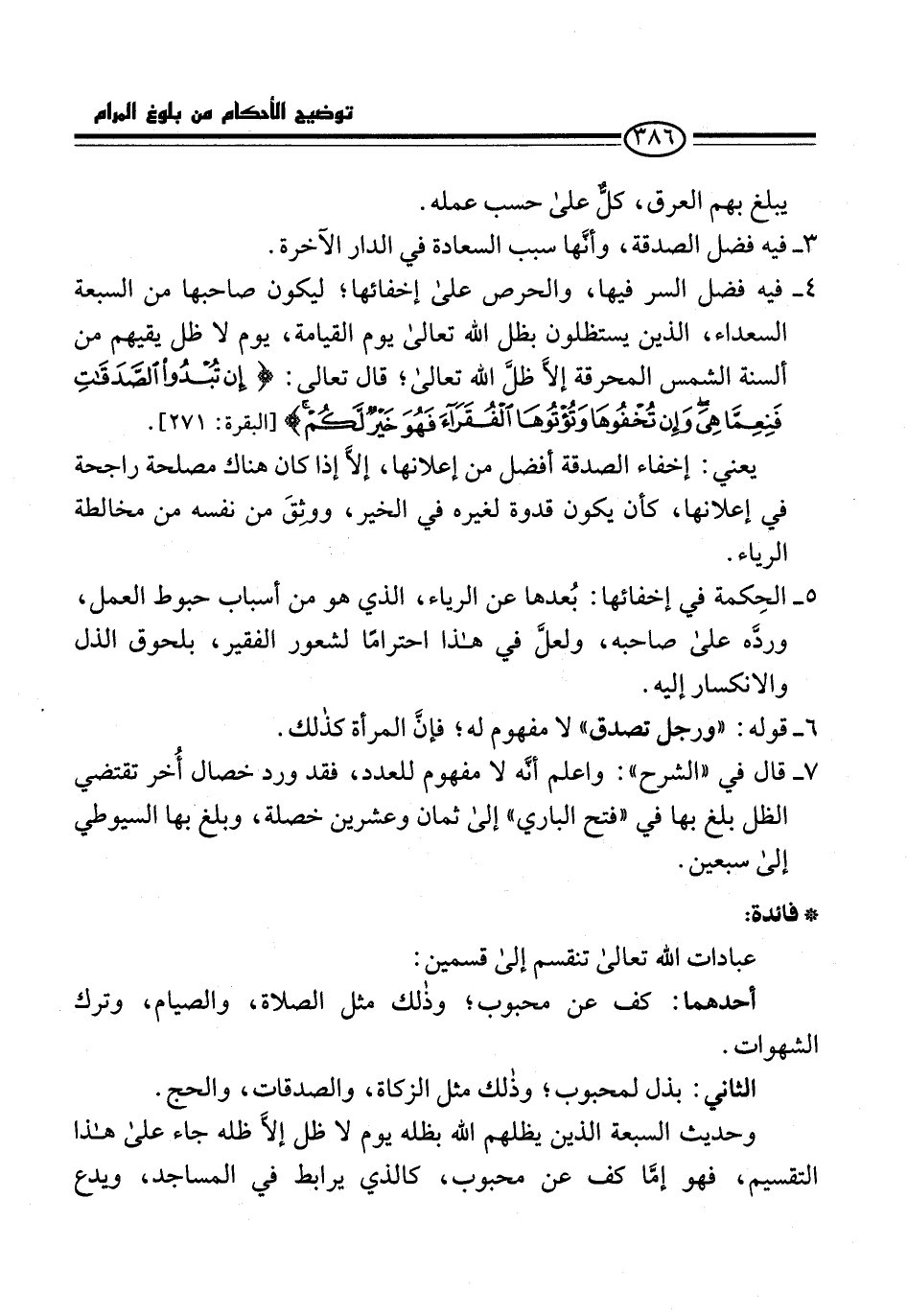 4 - فيه فضل السر فيها، والحرص على إخفائها؛ ليكون صاحبها من السبعة السعداء، الذين يستظلون بظل الله تعالى يوم القيامة، يوم لا ظل يقيهم من ألسنة الشمس المحرقة إلاَّ ظل الله تعالى؛ قال تعالى: {إِنْ تُبْدُوا الصَّدَقَاتِ فَنِعِمَّا هِيَ وَإِنْ تُخْفُوهَا وَتُؤْتُوهَا الْفُقَرَاءَ فَهُوَ خَيْرٌ لَكُمْ} [البقرة: 271].
