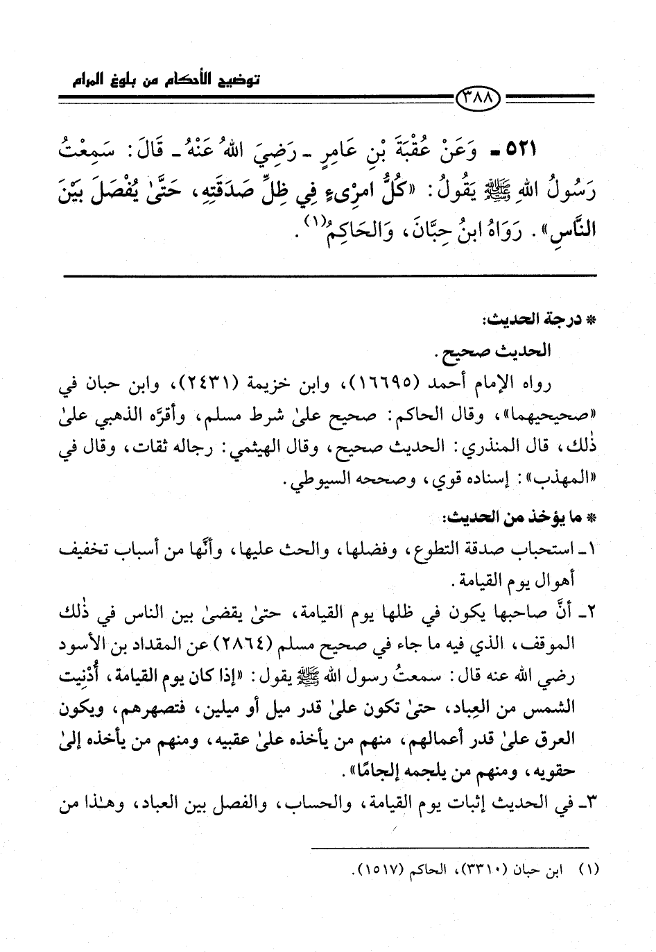 521 - وَعَنْ عُقْبَةَ بْنِ عَامِرٍ -رَضِيَ اللهُ عَنْهُ- قَالَ: سَمِعْتُ رَسُولُ اللهِ -صلى الله عليه وسلم- يقُولُ: "كُلُّ امْرِىءً فِي ظِلِّ صَدَقَتِهِ، حَتَّى يُفْصَلَ بيْنَ النَّاسِ". رَوَاهُ ابنُ حِبَّانَ، وَالحَاكِمُ (¬1).