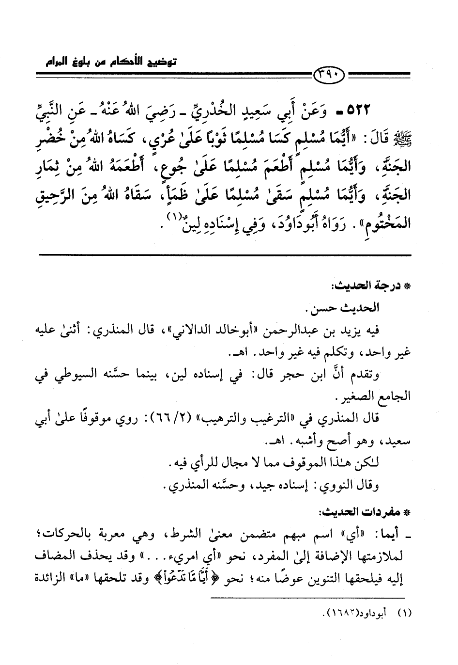 522 - وَعَنْ أَبِي سَعِيدٍ الخُدْرِيِّ -رَضِيَ اللهُ عَنْهُ- عَنِ النَّبِيِّ -صلى الله عليه وسلم- قَالَ: "أيُّمَا مُسْلِمٍ كَسَا مُسْلِمًا ثَوْبًا عَلَى عُرْيٍ، كَسَاهُ اللهُ مِنْ خُضْرِ الجَنَّةِ، وَأَيُّمَا مُسْلِمٍ أطْعَمَ مُسْلِمًا عَلَى جُوعٍ، أطْعَمَهُ اللهُ مِنْ ثِمَارِ الجَنَّةِ، وَأَيُّمَا مُسْلِمٍ سَقَى مُسْلِمًا عَلَى ظَمَأٍ، سَقَاهُ اللهُ مِنَ الرَّحِيقِ المَخْتومِ". رَوَاهُ أَبُو دَاوُدَ، وَفِي إِسْنَادِهِ لِينٌ (¬1).