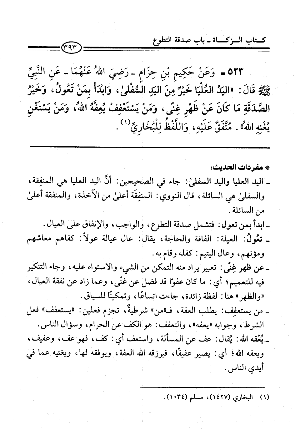 523 - وَعَنْ حَكِيمِ بْنِ حِزَامٍ -رَضِيَ اللهُ عَنْهُمَا- عَنِ النَّبِيِّ -صلى الله عليه وسلم- قَالَ: "اليَدُ العُلْيَا خَيْرٌ مِنَ اليَدِ السُّفْلى، وَابْدَأْ بِمَنْ تَعُولُ، وَخَيْرُ الصَّدَقَةِ مَا كَانَ عَنْ ظَهْرِ غِنًى، وَمَنْ يَسْتَعْفِفْ يُعِفَّهُ اللهُ، وَمَنْ يَسْتَغْنِ يُغْنِهِ اللهُ". مُتَّفَقٌ عَلَيْهِ، وَاللَّفْظُ لِلْبُخَارِيِّ (¬1).