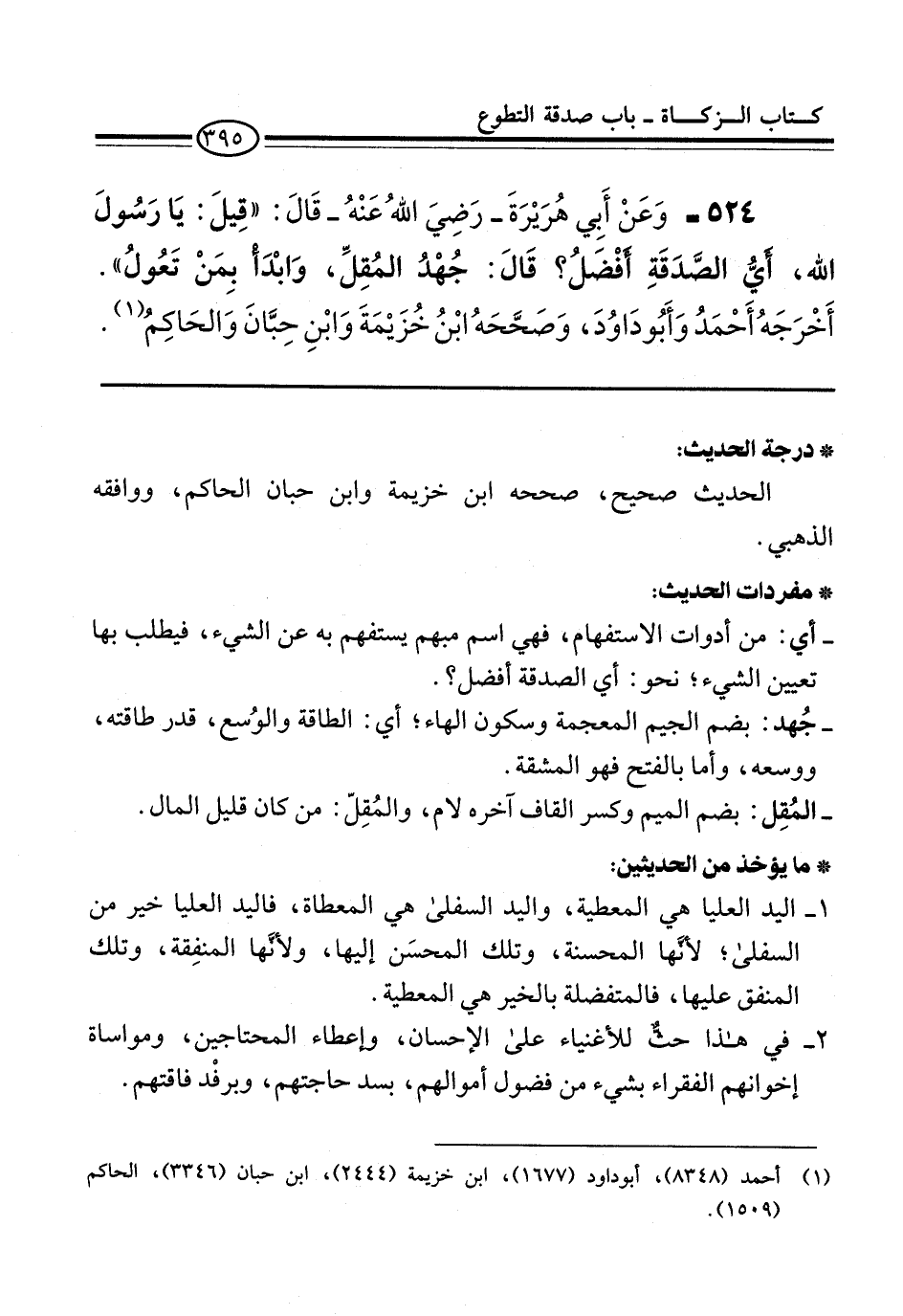 524 - وَعَنْ أَبِي هُرَيْرَةَ -رَضِيَ اللهُ عَنْهُ- قَالَ: "قِيلَ: يَا رَسُولَ الله، أَيُّ الصَّدَقَةِ أفْضَلُ؟ قَالَ: جُهْدُ المُقِلِّ، وَابْدَأ بِمَنْ تَعُولُ". أَخْرَجَهُ أَحْمَدُ وَأَبُو دَاوُدَ، وَصَحَّحَهُ ابْنُ خُزَيْمَةَ وَابْنِ حِبَّانَ وَالحَاكِمُ (¬1).