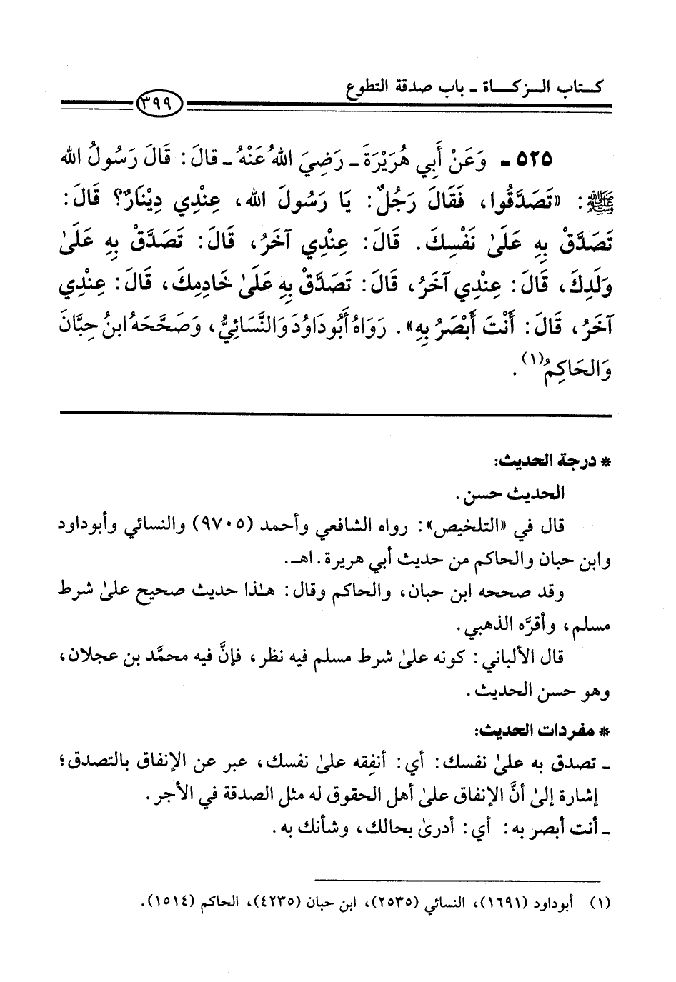 525 - وَعَنْ أَبِي هُرَيْرَةَ -رَضِيَ اللهُ عَنْهُ- قالَ: قَالَ رَسُولُ الله -صلى الله عليه وسلم-: "تَصَدَّقُوا، فَقَالَ رَجُلٌ: يَا رَسُولَ الله، عِنْدِي دِيْنارٌ؟ قَالَ: تَصَدَّقْ بِهِ عَلَى نَفْسِكَ. قَالَ: عِنْدِي آخَرُ، قَالَ: تَصَدَّقْ بِهِ عَلَى وَلَدِكَ، قَالَ: عِنْدِي آخَرُ، قَالَ: تَصَدَّقْ بِهِ عَلَى خَادِمِكَ، قَالَ: عِنْدِي آخَرُ، قَالَ: أنْتَ أَبْصَرُ بِهِ". رَوَاهُ أَبُو دَاوُدَ وَالنَّسَائِيُّ، وَصَحَّحَهُ ابنُ حِبَّانَ وَالحَاكِمُ (¬1).