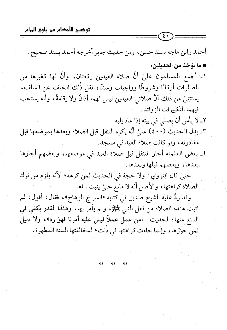 3 - يدل الحديث (400) على أنَّه يكره التنفل قبل الصلاة وبعدها بموضعها قبل مغادرته، ولو كانت صلاة العيد في مسجد.