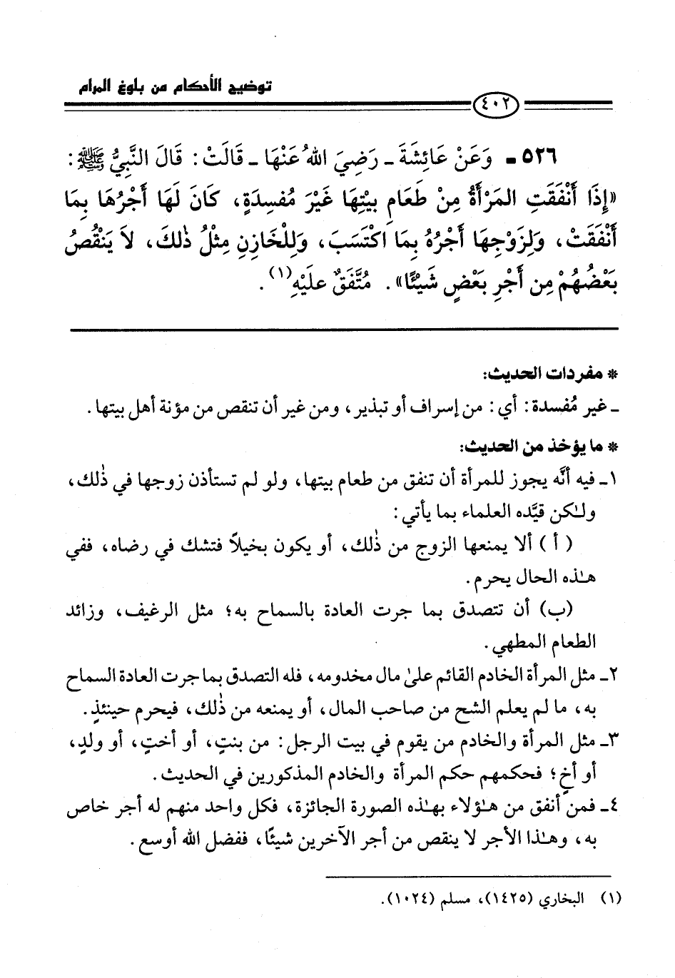 526 - وَعَنْ عَائِشَةَ -رَضِيَ اللهُ عَنْهَا- قَالَتْ: قَالَ النَّبِيُّ -صلى الله عليه وسلم-: "إِذَا أنْفَقَتِ المَرْأةُ مِنْ طَعَامِ بيْتِهَا غَيْرَ مُفسِدةٍ، كَانَ لَهَا أجْرُهَا بِمَا أنْفَقَتْ، وَلِزَوْجِهَا أجْرُهُ بِمَا اكْتَسَبَ، وَلِلْخَازِنِ مِثْلُ ذلكَ، لاَ يَنْقُصُ بَعْضُهُمْ مِن أجْرِ بَعْضٍ شَيْئًا". مُتَّفَقٌ علَيْهِ (¬1).