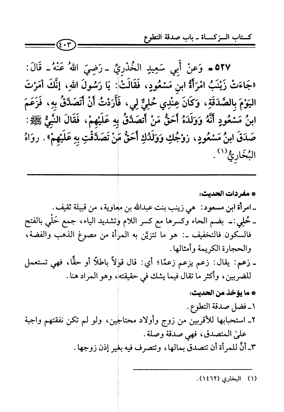 527 - وَعنْ أَبِي سَعِيدٍ الخُدْرِيِّ -رَضِيَ اللهُ عَنْهُ- قَالَ: "جَاءَتْ زَيْنَبُ امْرَأَةُ ابنِ مَسْعُودٍ، فَقَالَتْ: يَا رَسُولَ اللهِ، إنَّكَ أمَرْتَ اليَوْمَ بِالصَّدَقَةِ، وَكانَ عِنْدِي حُلِيٌّ لِي، فَأَرَدْتُ أنْ أَتَصَدَّقُ بهِ، فَزَعَمَ ابنُ مَسْعُودٍ أنَّهُ وَوَلَدَهُ أَحَقُّ مَنْ أتصَدَّقُ بِهِ عَلَيْهِمْ، فَقَالَ النَّبِيُّ -صلى الله عليه وسلم-: صَدَقَ ابن مَسْعُودٍ، زوْجُكِ وَوَلَدُكِ أحَقُّ مَنْ تَصَدَّقْتِ بِهِ عَلَيْهِمْ". روَاهُ البُخَارِيُّ (¬1).