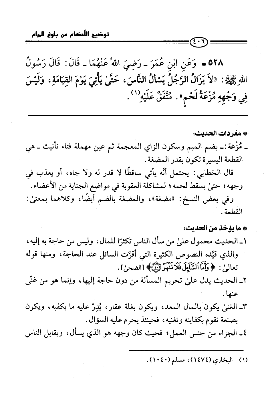528 - وَعَنِ ابْنِ عُمَرَ -رَضِيَ اللهُ عَنْهُمَا- قَالَ: قَالَ رَسُولُ اللهِ -صلى الله عليه وسلم-: "لاَ يَزَالُ الرَّجُلُ يَسْألُ النَّاسَ، حَتَّى يَأْتِيَ يَوْمَ القِيَامَةِ، وَلَيْسَ فِي وَجْهِهِ مُزْعَةُ لَحْمٍ". مُتَّفَقٌ عَلَيْهِ (¬1).
