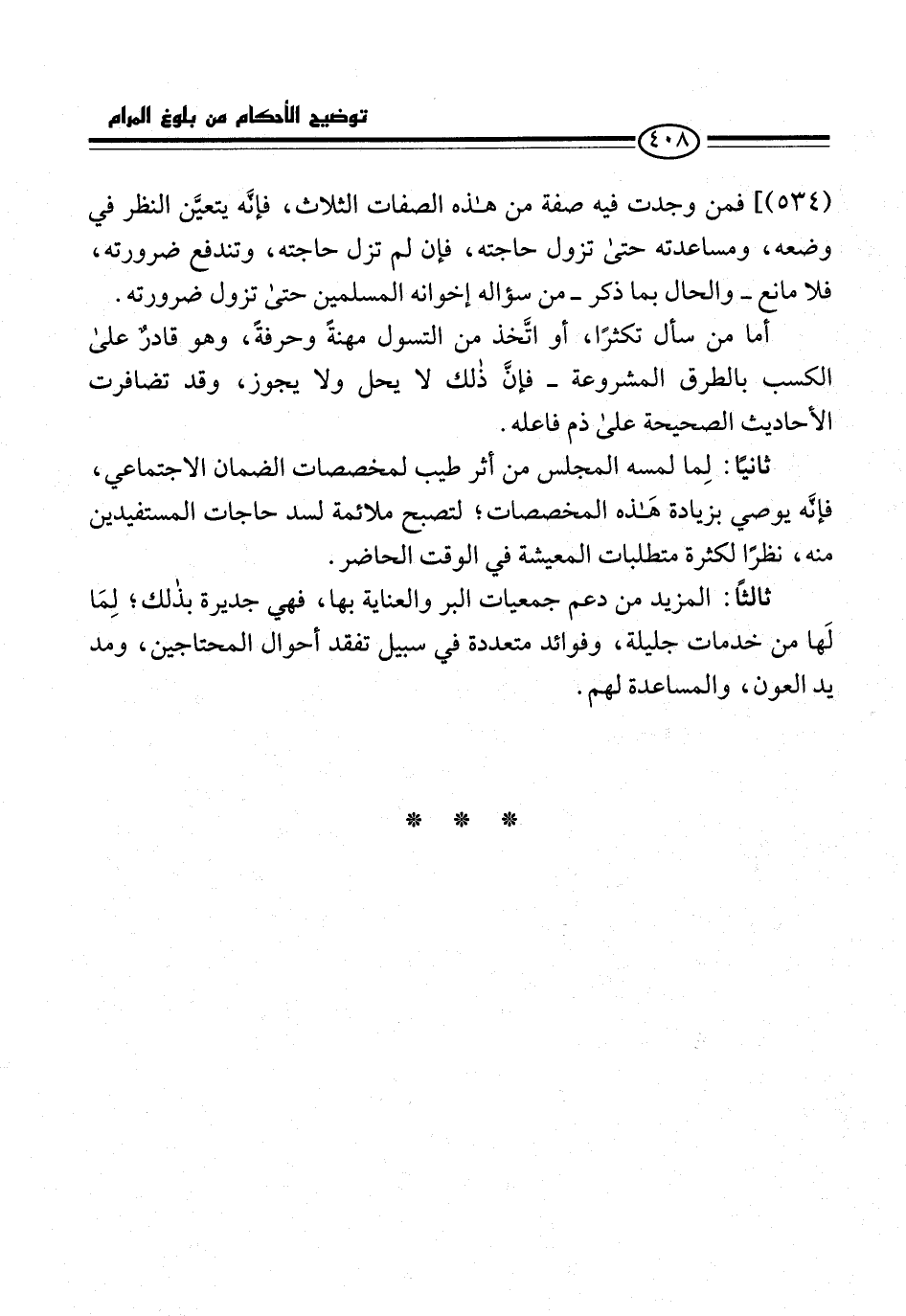 (534)] فمن وجدت فيه صفة من هذه الصفات الثلاث، فإنَّه يتعيَّن النظر في وضعه، ومساعدته حتى تزول حاجته، فإن لم تزل حاجته، وتندفع ضرورته، فلا مانع -والحال بما ذكر- من سؤاله إخوانه المسلمين حتى تزول ضرورته.