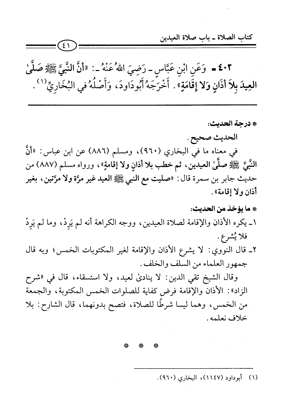 402 - وَعَنِ ابْنِ عَبَّاسٍ -رَضِيَ اللهُ عَنْهُ-: "أنَّ النَّبيَّ -صلى الله عليه وسلم- صَلَّى العِيدَ بِلاَ أذَانٍ وَلا إِقَامَةٍ". أَخْرَجَهُ أَبُو دَاودَ، وَأَصْلُهُ في البُخَارِيِّ (¬1).
