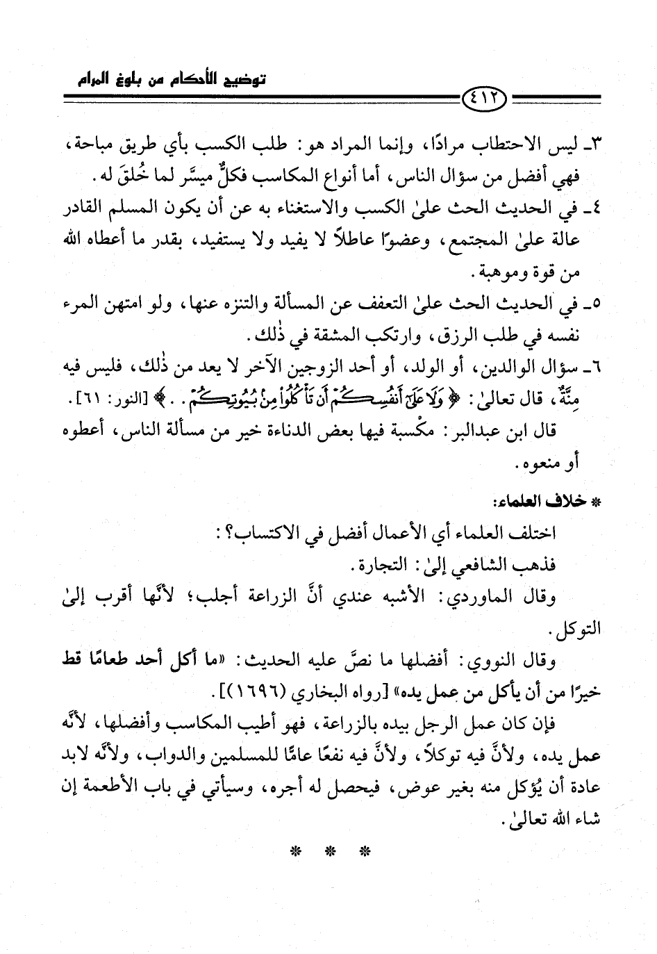 وقال النووي: أفضلها ما نصَّ عليه الحديث: "ما أكل أحد طعامًا قط خيرًا من أن يأكل من عمل يده" [رواه البخاري (1696)].