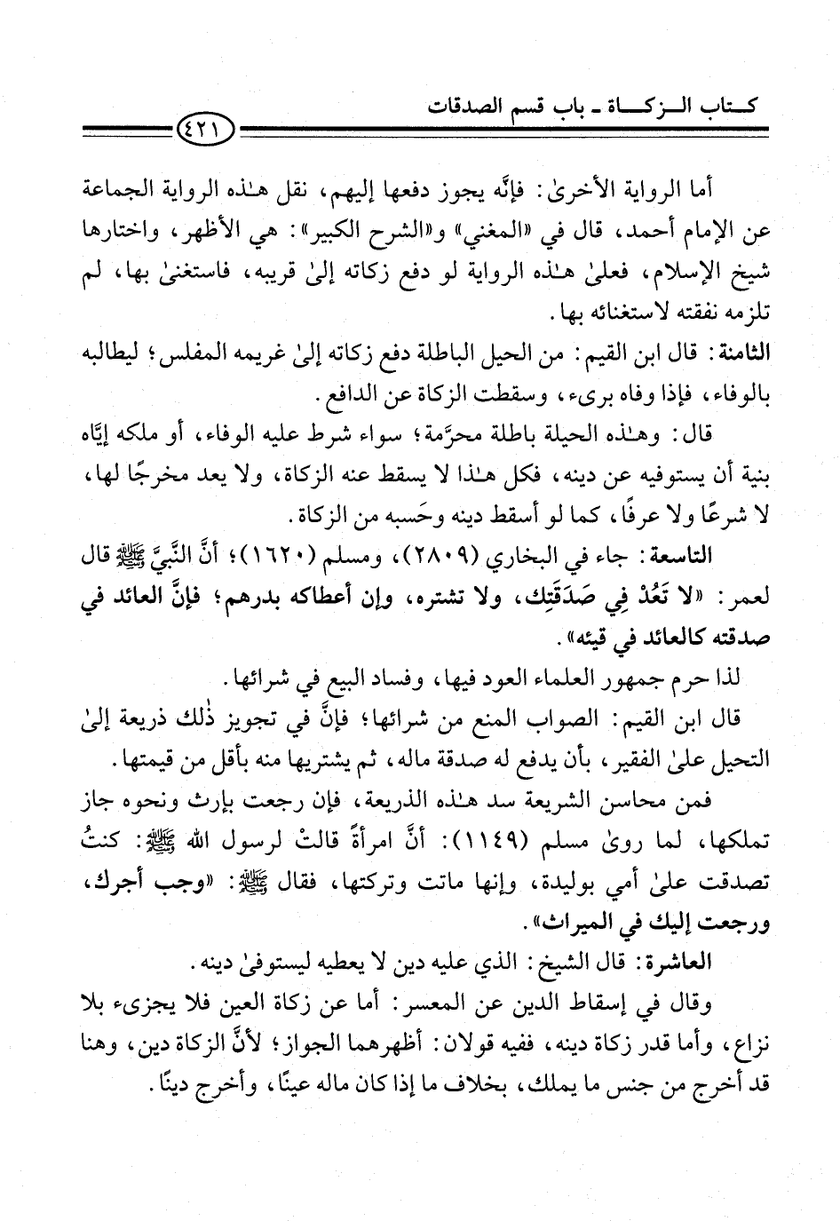 الثامنة: قال ابن القيم: من الحيل الباطلة دفع زكاته إلى غريمه المفلس؛ ليطالبه بالوفاء، فإذا وفاه برىء، وسقطت الزكاة عن الدافع.
