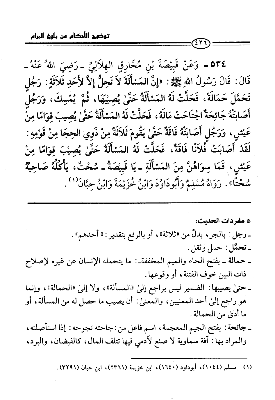 534 - وَعَنْ قَبِيْصَةَ بْنِ مُخَارِقٍ الهِلاَلِيِّ -رَضِيَ اللهُ عَنْهُ- قَالَ: قَالَ رَسُولُ اللهِ -صلى الله عليه وسلم-: "إِنَّ المَسْأَلَةَ لاَ تَحِلُّ إلاَّ لأَحَدِ ثَلاَثَةٍ: رَجُلٍ تَحَمَّلَ حَمَالَةً، فَحَلَّتْ لَهُ المَسْأَلَةُ حَتَّى يُصِيْبَهَا، ثُمَّ يُمْسِكَ، وَرَجُلٍ أَصَابتهُ جَائِحَةٌ اجْتَاحَتْ مَالَهُ، فَحَلَّتْ لَهُ المَسْأَلَةُ حَتَّى يُصِيبَ قِوَامًا مِنْ عَيْشٍ، وَرَجُلٍ أصَابَتْهُ فَاقَةٌ حَتَّى يَقُومَ ثَلاَثَةٌ مِنْ ذَوِي الحِجَا مِنْ قَوْمهِ: لَقَدْ أصَابَتْ فُلاَنًا فَاقَةٌ، فَحَلَّتْ لَهُ المَسْأَلَةُ حَتَّى يُصِيْبَ قِوَامًا مِنْ عَيْشٍ، فَمَا سِوَاهُنَّ مِنَ المَسْأَلَةِ -يَا قَبِيْصَةُ- سُحْتٌ، يَأْكُلُهُ صَاحِبُهُ سُحْتًا". رَوَاهُ مُسْلِمٌ وَأَبُو دَاوُدَ وَابْنُ خُزَيْمَةَ وَابْنُ حِبَّانَ (¬1).