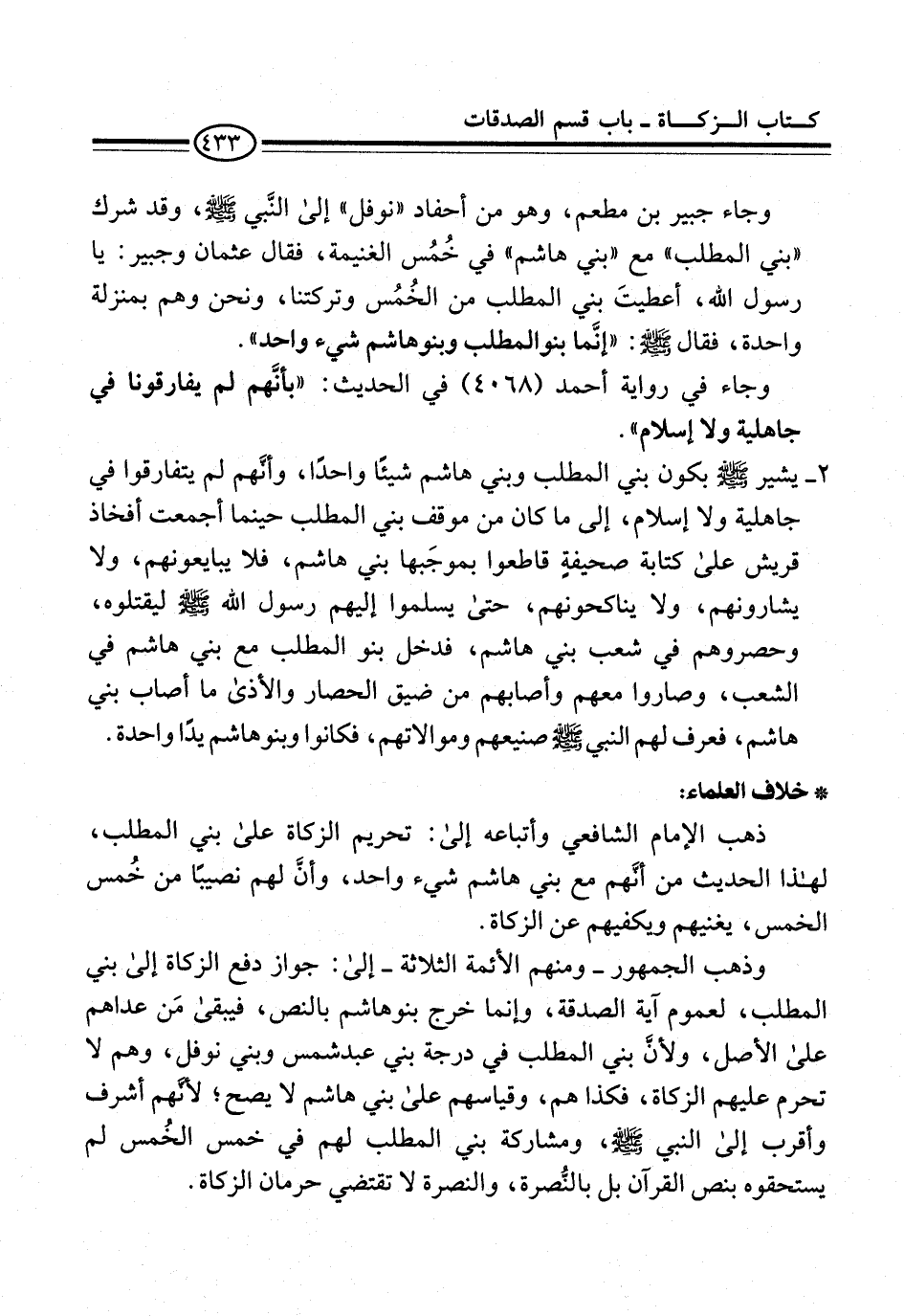وذهب الجمهور -ومنهم الأئمة الثلاثة- إلى: جواز دفع الزكاة إلى بني المطلب، لعموم آية الصدقة، وإنما خرج بنو هاشم بالنص، فيبقى مَن عداهم على الأصل، ولأنَّ بني المطلب في درجة بني عبد شمس وبني نوفل، وهم لا تحرم عليهم الزكاة، فكذا هم، وقياسهم على بني هاشم لا يصح؛ لأنَّهم أشرف وأقرب إلى النبي -صلى الله عليه وسلم-، ومشاركة بني المطلب لهم في خمس الخُمس لم يستحقوه بنص القرآن بل بالنُّصرة، والنصرة لا تقتضي حرمان الزكاة.
