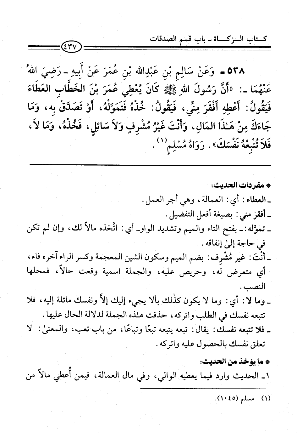 538 - وَعَنْ سَالِمِ بْنِ عَبْدِ الله بْنِ عُمَرَ عَنْ أَبِيهِ -رَضِيَ اللهُ عَنْهُمَا-: "أَنَّ رَسُولَ اللهِ -صلى الله عليه وسلم- كانَ يُعْطِي عُمَرَ بْنَ الخَطَّابِ العَطَاءَ فَتقُولُ: أَعْطِهِ أفْقَرَ مِنِّي، فَتقُولُ: خُذْهُ فَتَمَوَّلْهُ، أوْ تَصَدَّقْ بِه، وَمَا جَاءَكَ مِنْ هَذَا المَالِ، وَأنْتَ غَيْرُ مُشْرِفٍ وَلاَ سَائِلٍ، فَخُذْهُ، وَمَا لاَ، فَلاَ تُتْبِعْهُ نَفْسَكَ". رَوَاهُ مُسْلِمٍ (¬1).