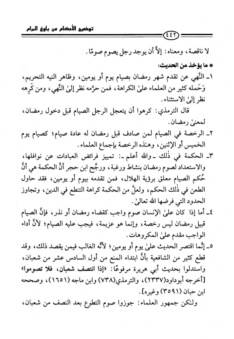 1 - النَّهي عن تقدم شهر رمضان بصيام يوم أو يومين، وظاهر النيه التحريم، وَحَمله كثير من العلماء على الكراهة، فمن حرَّمه نظر إلى النَّهي، ومن كَرِهه نظر إلى الاستثناء.