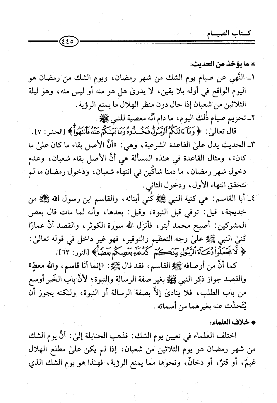 1 - النَّهي عن صيام يوم الشك من شهر رمضان، ويوم الشك من رمضان هو اليوم الواقع في أوله بلا يقين، لا يدرى هل هو منه أو ليس منه، وهو ليلة الثلاثين من شعبان إذا حال دون منظر الهلال ما يمنع الرؤية.