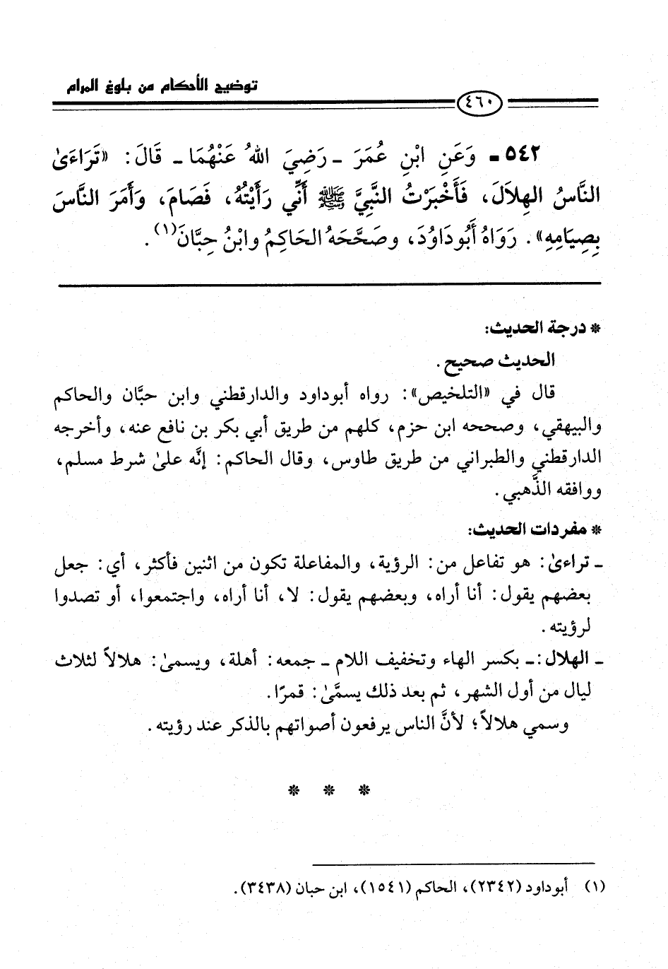542 - وَعَنِ ابْنِ عُمَرَ -رَضِيَ اللهُ عَنْهُمَا- قَالَ: "تَرَاءَى النَّاسُ الهِلاَلَ، فَأَخْبَرْتُ النَّبِيَّ -صلى الله عليه وسلم- أَنِّي رَأَيْتُهُ، فَصَامَ، وَأَمَرَ النَّاسَ بِصِيَامِهِ". رَوَاهُ أَبُو دَاوُدَ، وصَحَّحَهُ الحَاكِمُ وابْنُ حِبَّانَ (¬1).