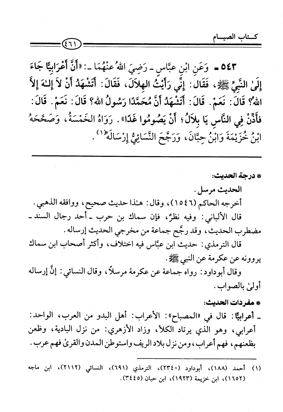 543 - وَعَنِ ابْن عبَّاسٍ -رَضِيَ اللهُ عنْهُمَا-: "أَنَّ أعْرَابِيًّا جَاءَ إِلَى النَّبِيِّ -صلى الله عليه وسلم-، فَقَال: إِنِّي رَأيْتُ الهِلاَلَ، فَقَالَ: أَتَشْهَدُ أنْ لاَ إِلهَ إِلاَّ اللهُ؟ قَالَ: نَعَمْ. قَالَ: أَتَشْهَدُ أنَّ مُحَمَّدًا رَسُولُ الله؟ قَالَ: نَعَمْ. قَالَ: فأَذِّنْ فِي النَّاسِ يَا بِلاَلُ؛ أنْ يَصُومُوا غَدًا". رَوَاهُ الخَمْسَةُ، وَصَحَّحَهُ ابْنُ خُزَيْمَةَ وَابْنُ حِبَّانَ، وَرَجَّحَ النَّسَائِيُّ إِرْسَالَهُ (¬1).