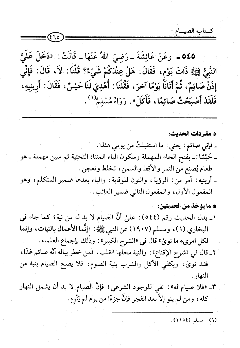 545 - وعَنْ عَائِشَةَ -رَضِيَ اللهُ عَنْهَا- قَالَتْ: "دَخَلَ عَلَيَّ النَّبِيُّ -صلى الله عليه وسلم- ذَاتَ يَوْمٍ، فَقَالَ: هَلْ عِنْدَكُمْ شَيْءٌ؟ قُلْنَا: لاَ، قَالَ: فَإِنِّي إِذَنْ صَائِمٌ، ثُمَّ أَتَانَا يَوْمًا آخرَ، فَقُلْنَا: أُهْدِيَ لَنَا حَيْسٌ، فَقَالَ: أرِينِيهِ، فَلَقَدْ أصْبَحْتُ صَائِمًا، فَأَكَلَ". رَوَاهُ مُسْلِمٌ (¬1).