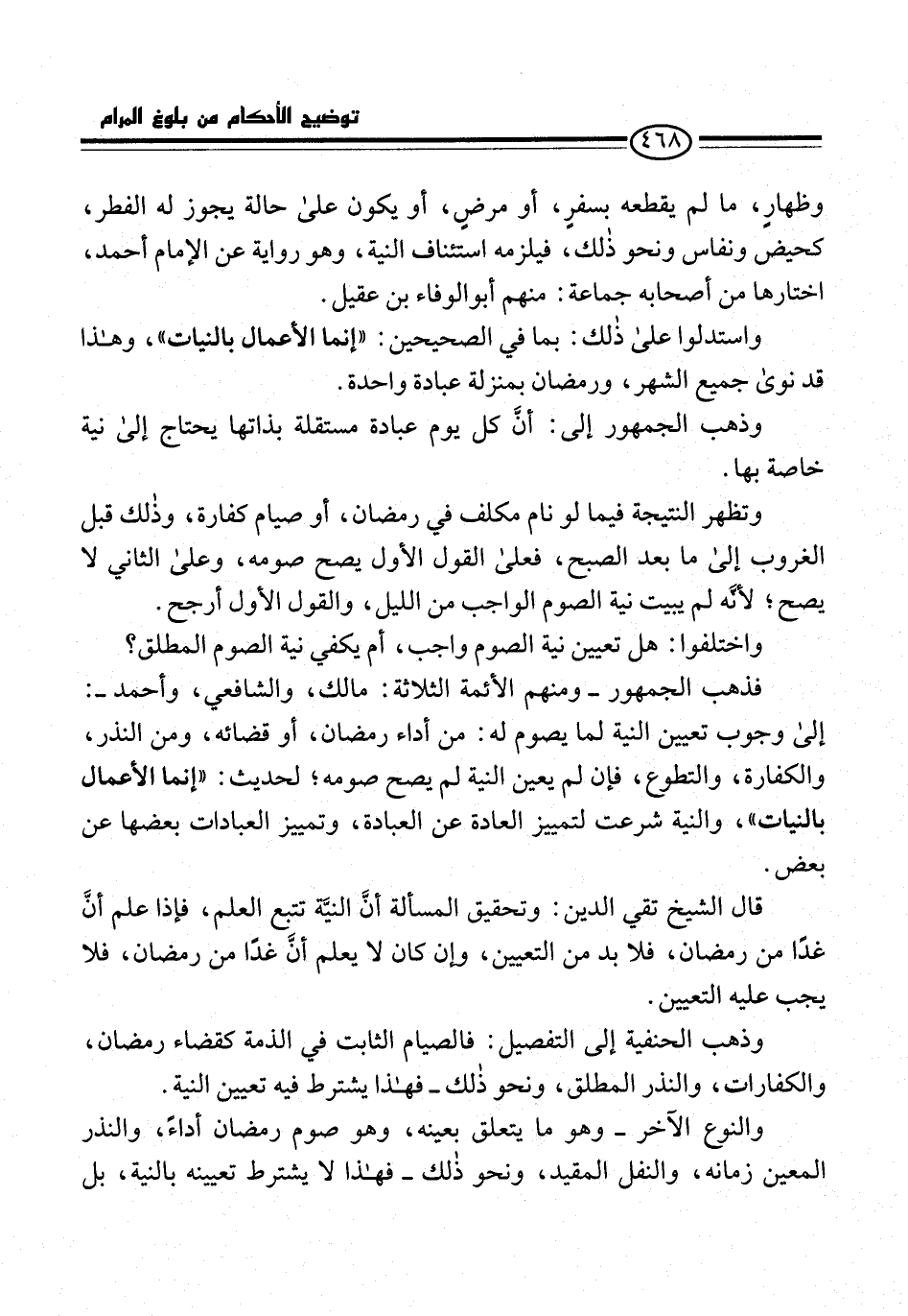 قال الشيخ تقي الدين: وتحقيق المسألة أنَّ النيَّة تتبع العلم، فإذا علم أنَّ غدًا من رمضان، فلابد من التعيين، وإن كان لا يعلم أنَّ غدًا من رمضان، فلا يجب عليه التعيين.