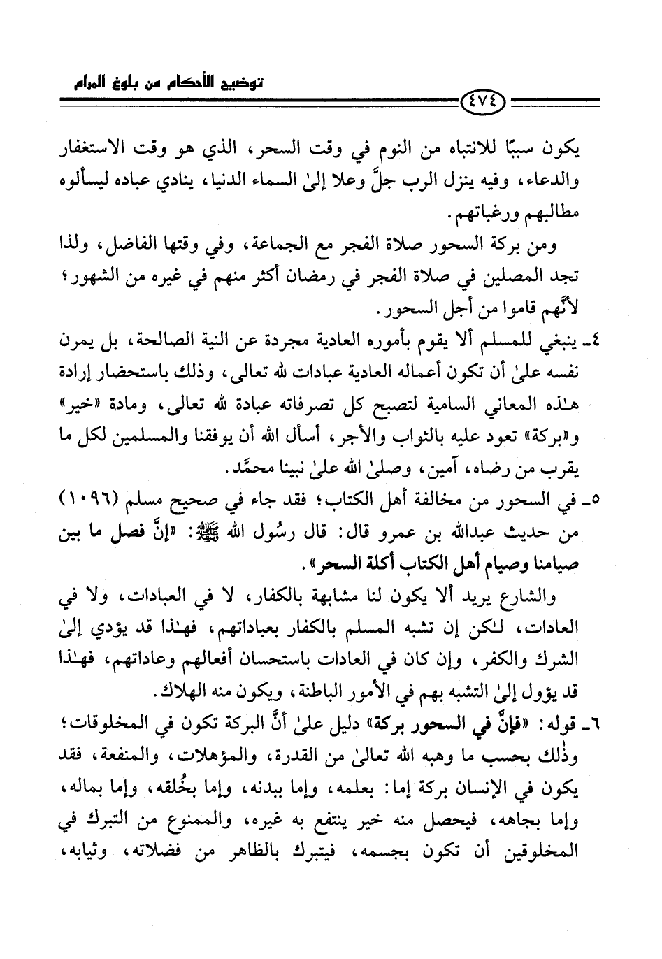 5 - في السحور من مخالفة أهل الكتاب؛ فقد جاء في صحيح مسلم (1096) من حديث عبد الله بن عمرو قال: قال رسُول الله -صلى الله عليه وسلم-: "إنَّ فصل ما بين صيامنا وصيام أهل الكتاب أكلة السحر".