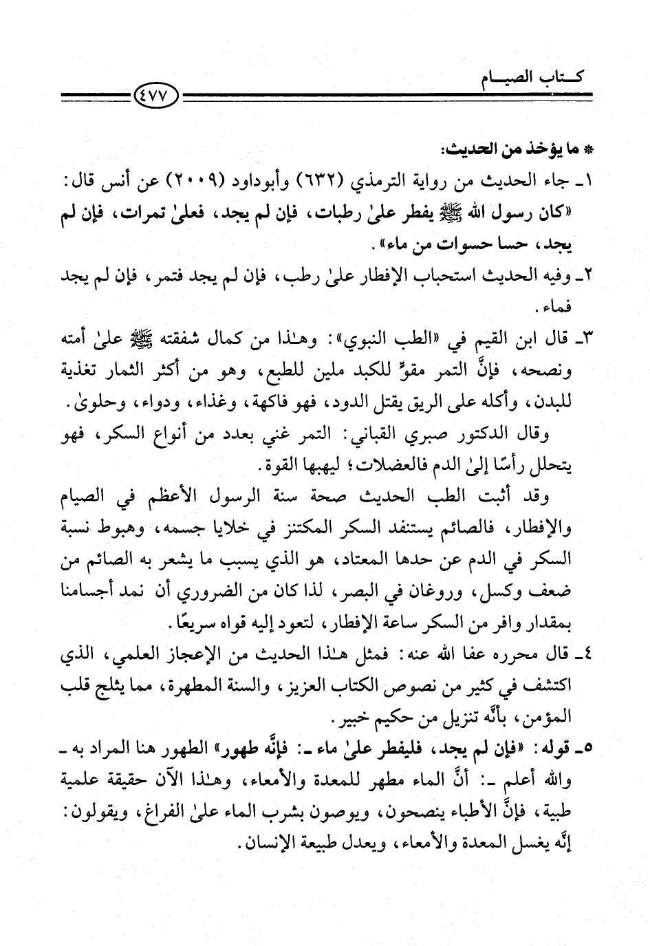 5 - قوله: "فإن لم يجد، فليفطر على ماء-: فإنَّه طهور" الطهور هنا المراد به -والله أعلم-: أنَّ الماء مطهر للمعدة والأمعاء، وهذا الآن حقيقة علمية طبية، فإنَّ الأطباء ينصحون، ويوصون بشرب الماء على الفرك، ويقولون: إنَّه يغسل المعدة والأمعاء، ويعدل طبيعة الإنسان.